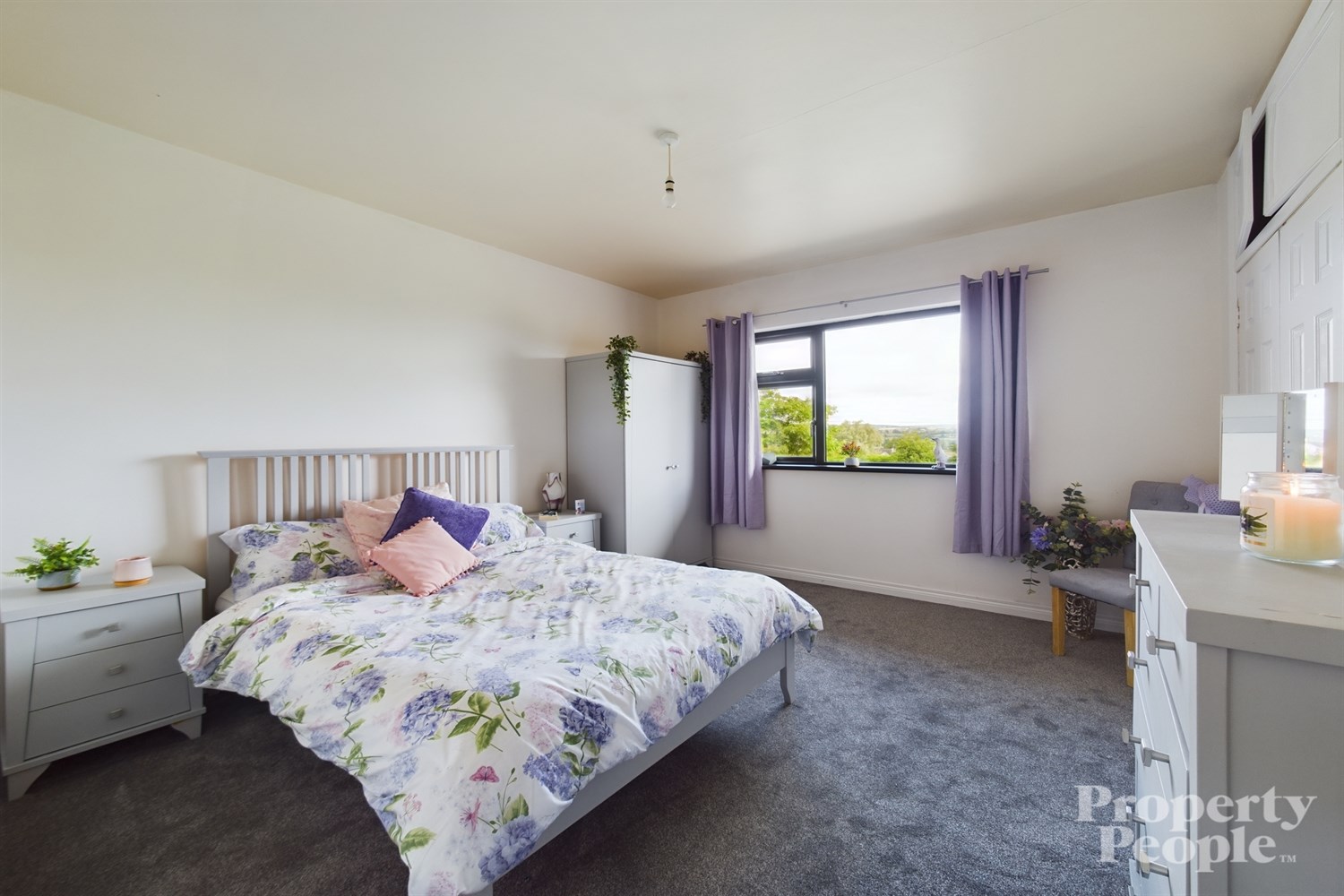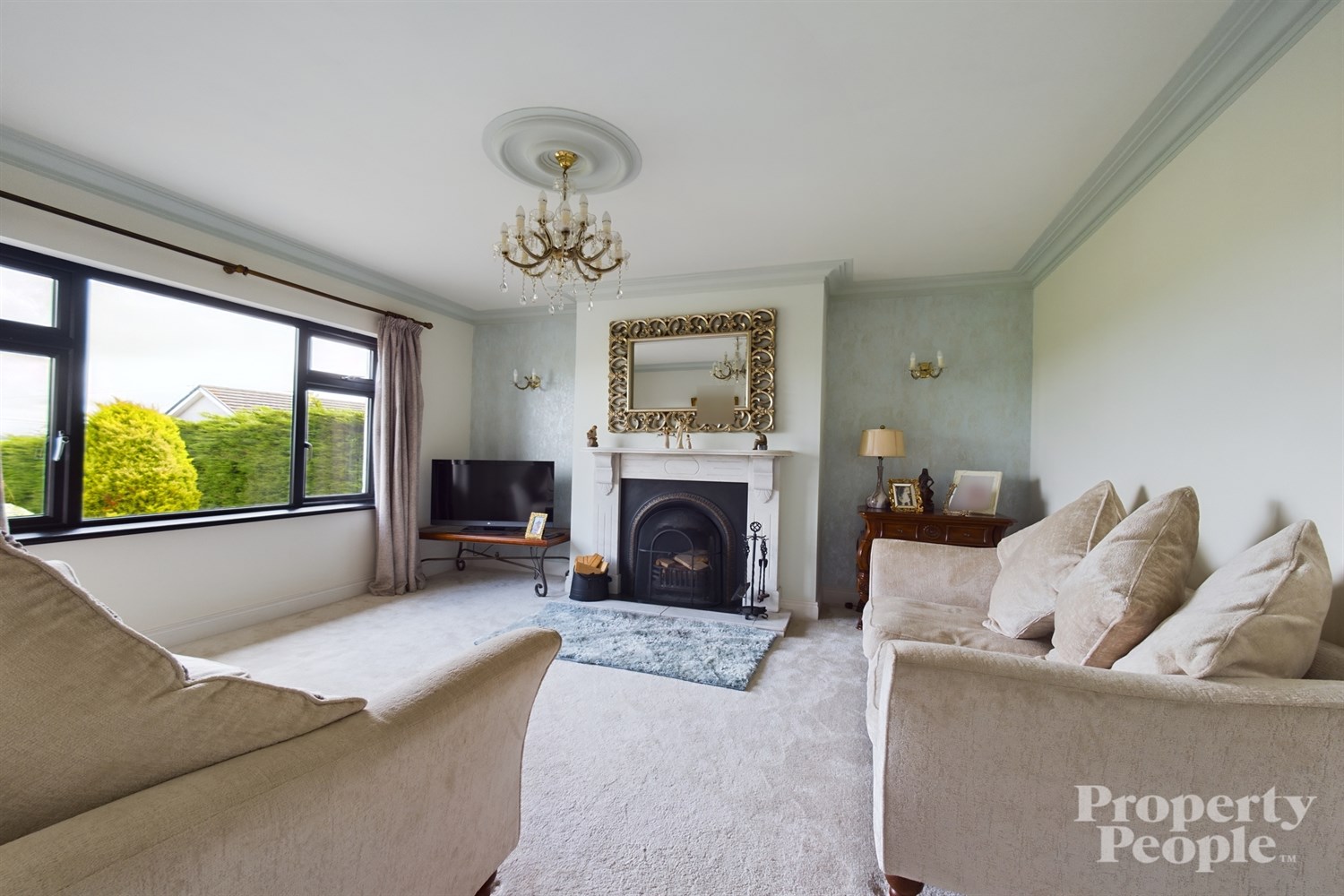 This detached bungalow has a well-manicured lawn, framed with a lush evergreen hedge and a sweeping tarmac driveway at the front of the property giving the entrance everything you would expect from a country family residence. The interior is tastefully decorated throughout in warm neutral tones and its large windows allow plenty of natural light to flood the rooms to give a bright and airy feel. Just off the main entrance hall is the main lounge featuring a cosy open fireplace with a solid fuel fire, a cornice-framed ceiling, and a large window that makes the most of the stunning views from this part of the property.