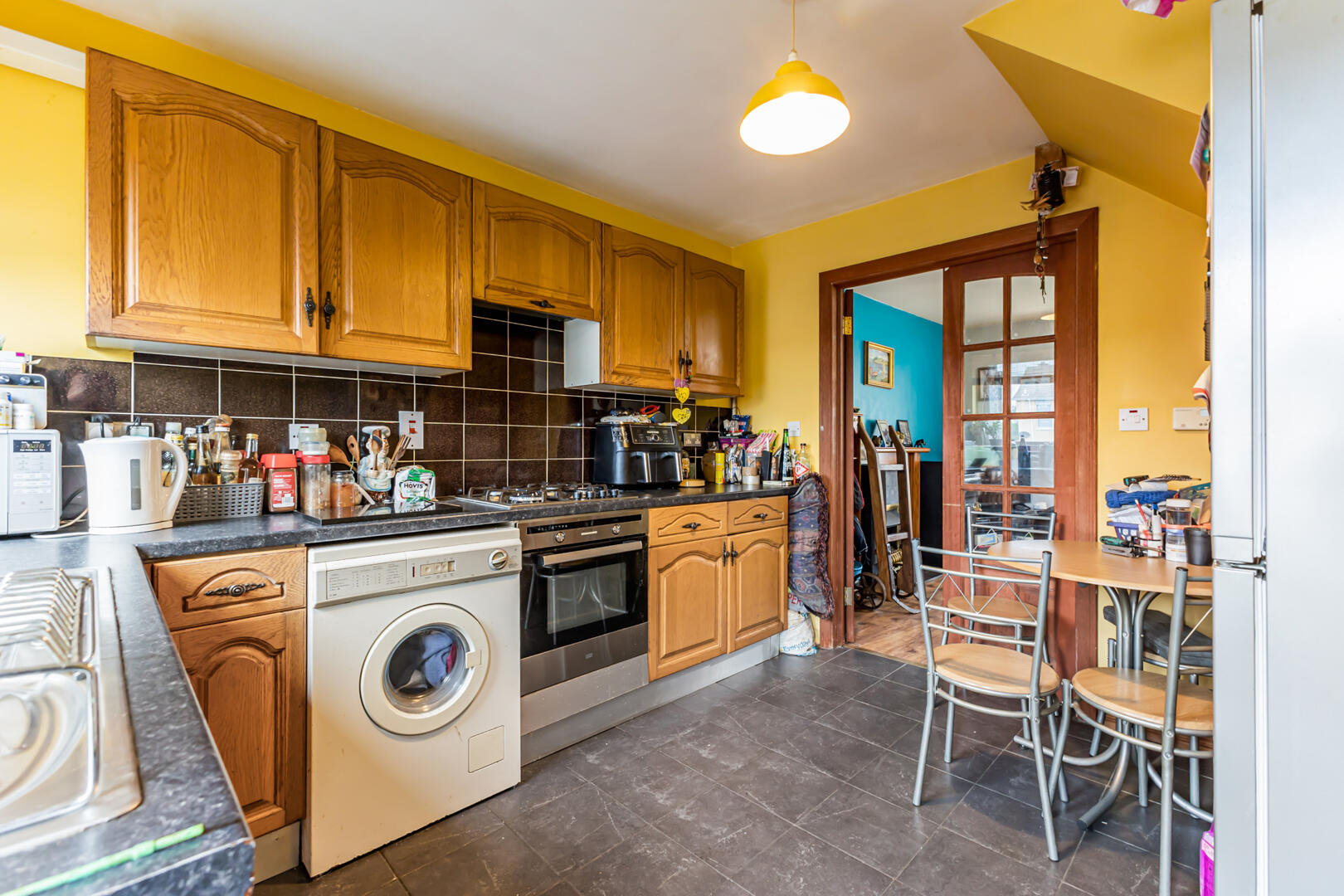 Kitchen / Dining - 3.38m x 2.87m (11'1" x 9'5") - Ceramic tiled floor, tiled splashback, outlook to rear, uPVC door with double glazed inset to rear garden, under stair storage, range of low and high level units with solid wood doors and laminate work surface, space for fridge / freezer, four ring gas hob, extractor fan, integrated electric oven / grill, 1 ? stainless steel sink and drainer with chrome mixer tap