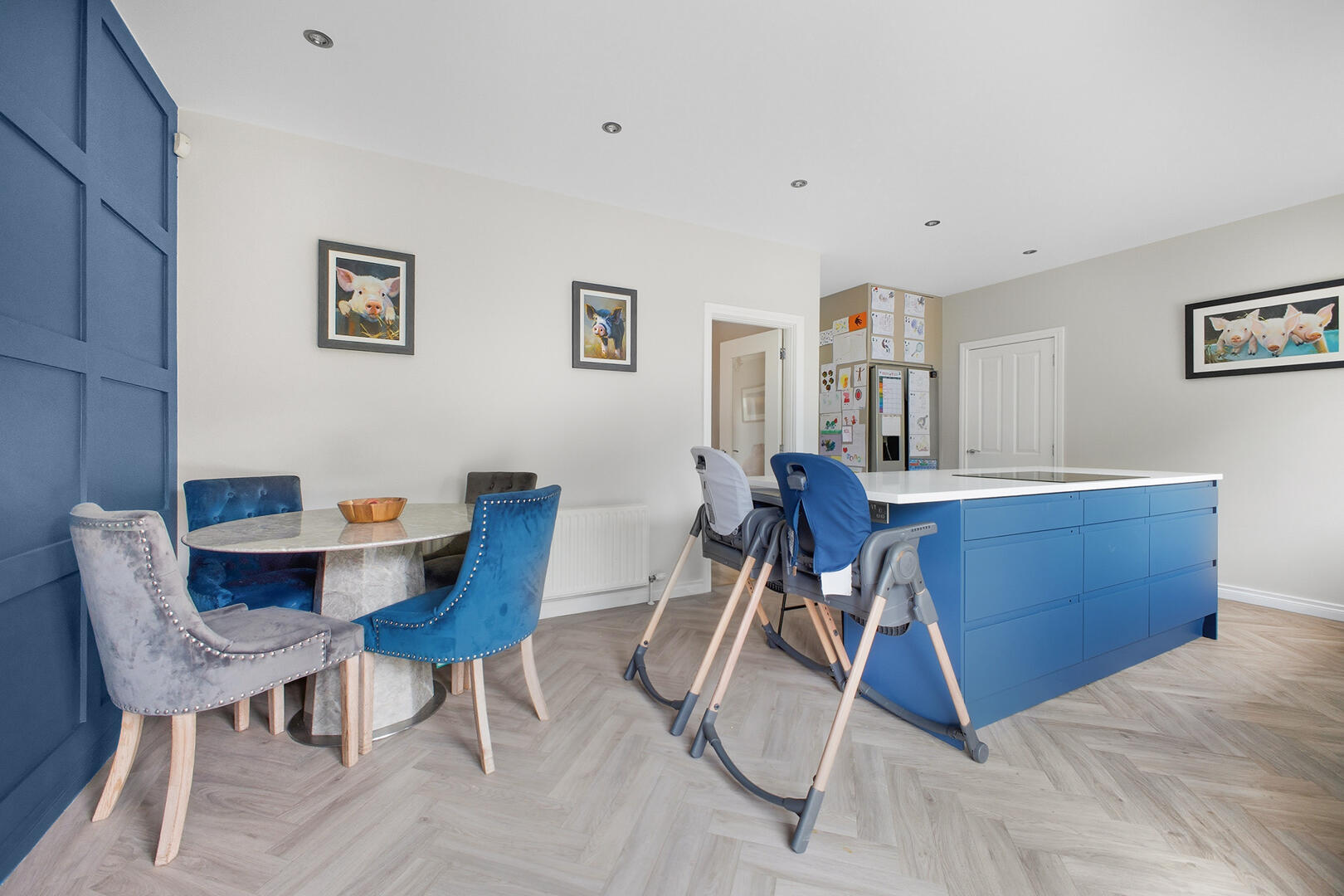 Kitchen / Living / Dining - 3.76 x 5.96 (12'4" x 19'6") - Parquet wood laminate flooring, feature wood panel wall, recessed spot lights, Range of low and high level units, quartz worktops, Island with breakfast bar seating, space for fridge / freezer, Hotpoint induction 5 ring hob, extractor, Blanco hot water tap, inset stainless steel sink, Bosch double electric oven / grill, integrated dishwasher, pull out bins, display shelves, French doors to rear garden, ample dining space