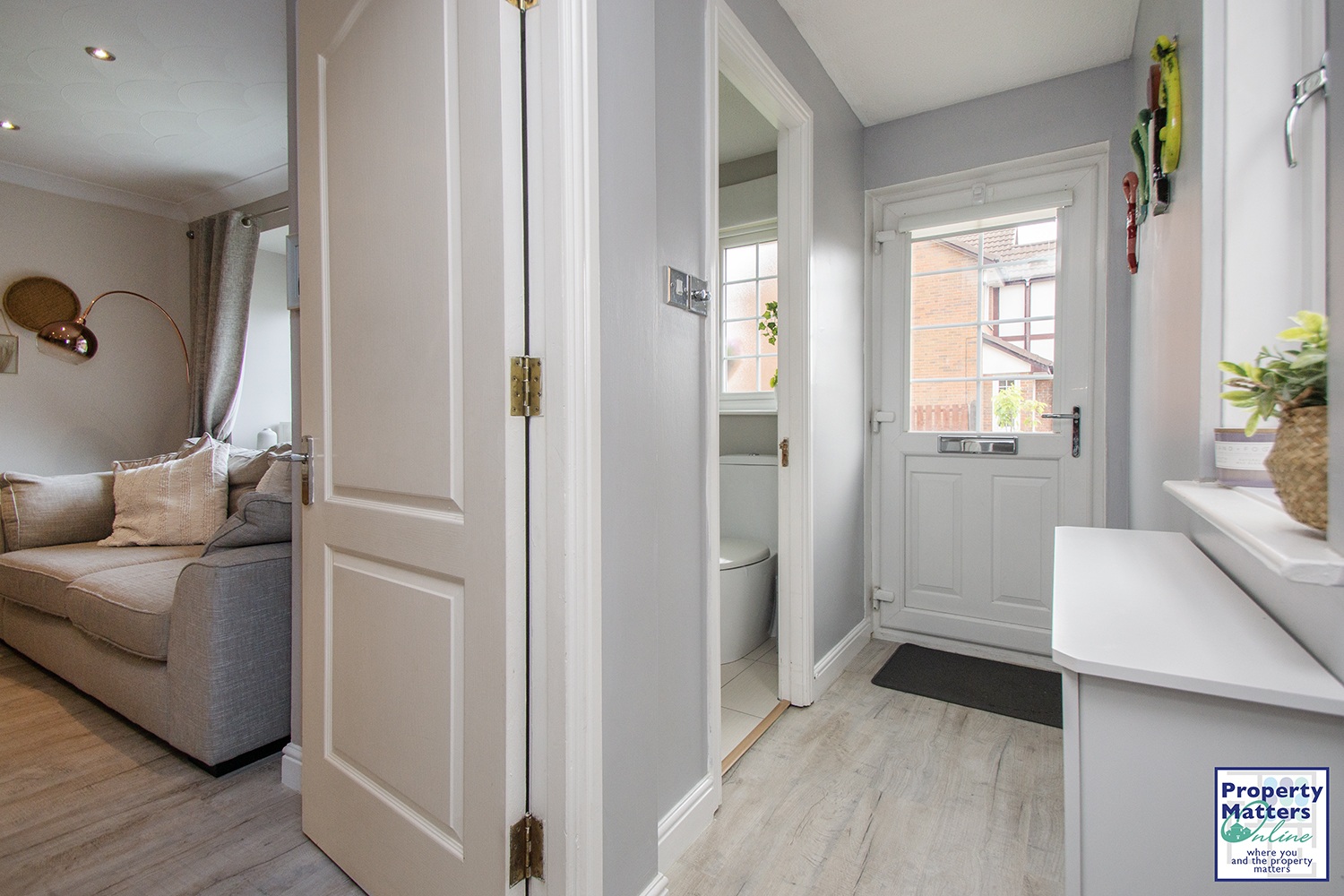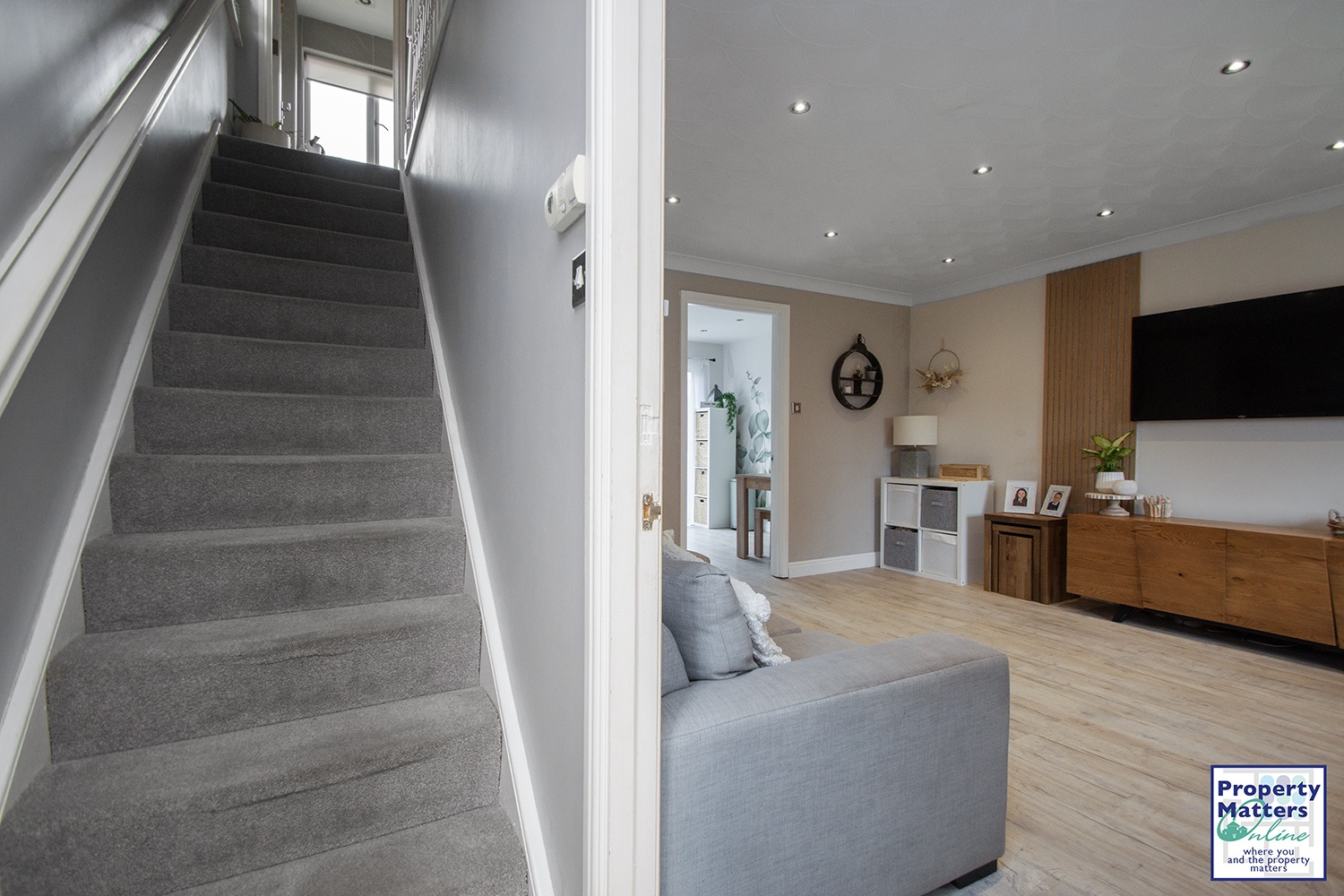 The accommodation comprises a welcoming entrance hallway with staircase to the upper floor and convenient downstairs WC. The bright and spacious lounge benefits from a useful storage cupboard, while the heart of the home is the recently upgraded kitchen/diner – featuring ample upper and lower cabinets, integrated fridge freezer, oven, induction hob, and breakfast bar. Sliding patio doors lead out to a private, enclosed rear garden, perfect for relaxing or entertaining.