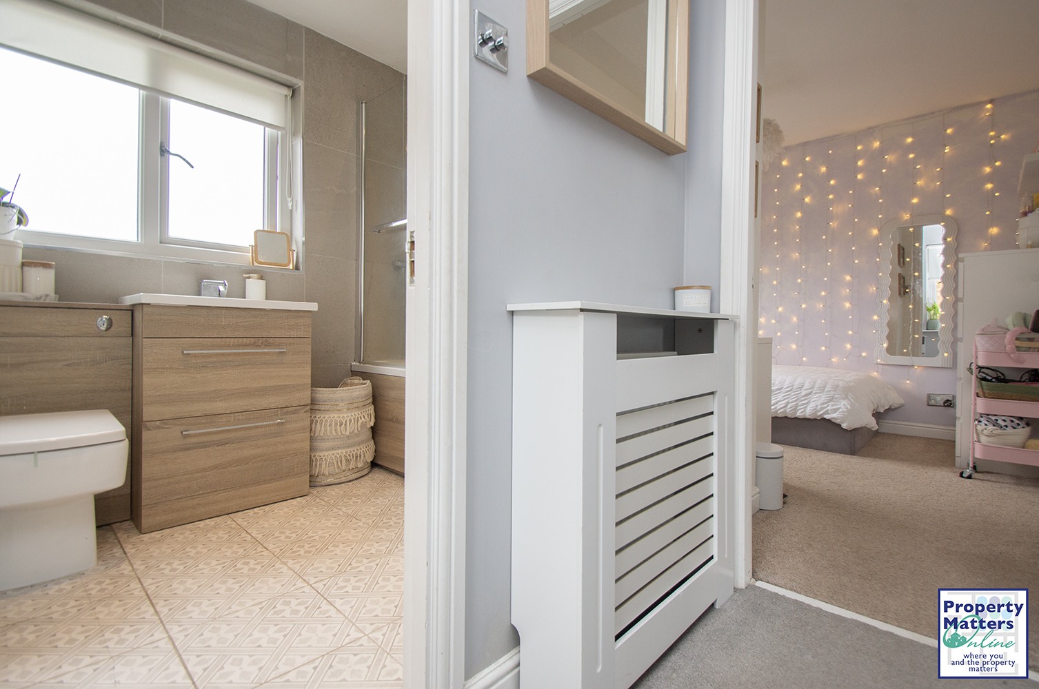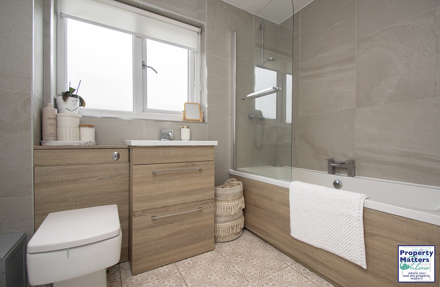 Upstairs, the generous landing area includes an additional storage cupboard and gives access to three well-proportioned bedrooms, each offering built-in storage. The stylish family bathroom has also been recently upgraded and comprises a WC, wash hand basin, and a bath with overhead shower.