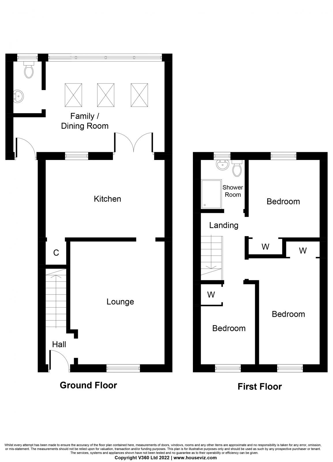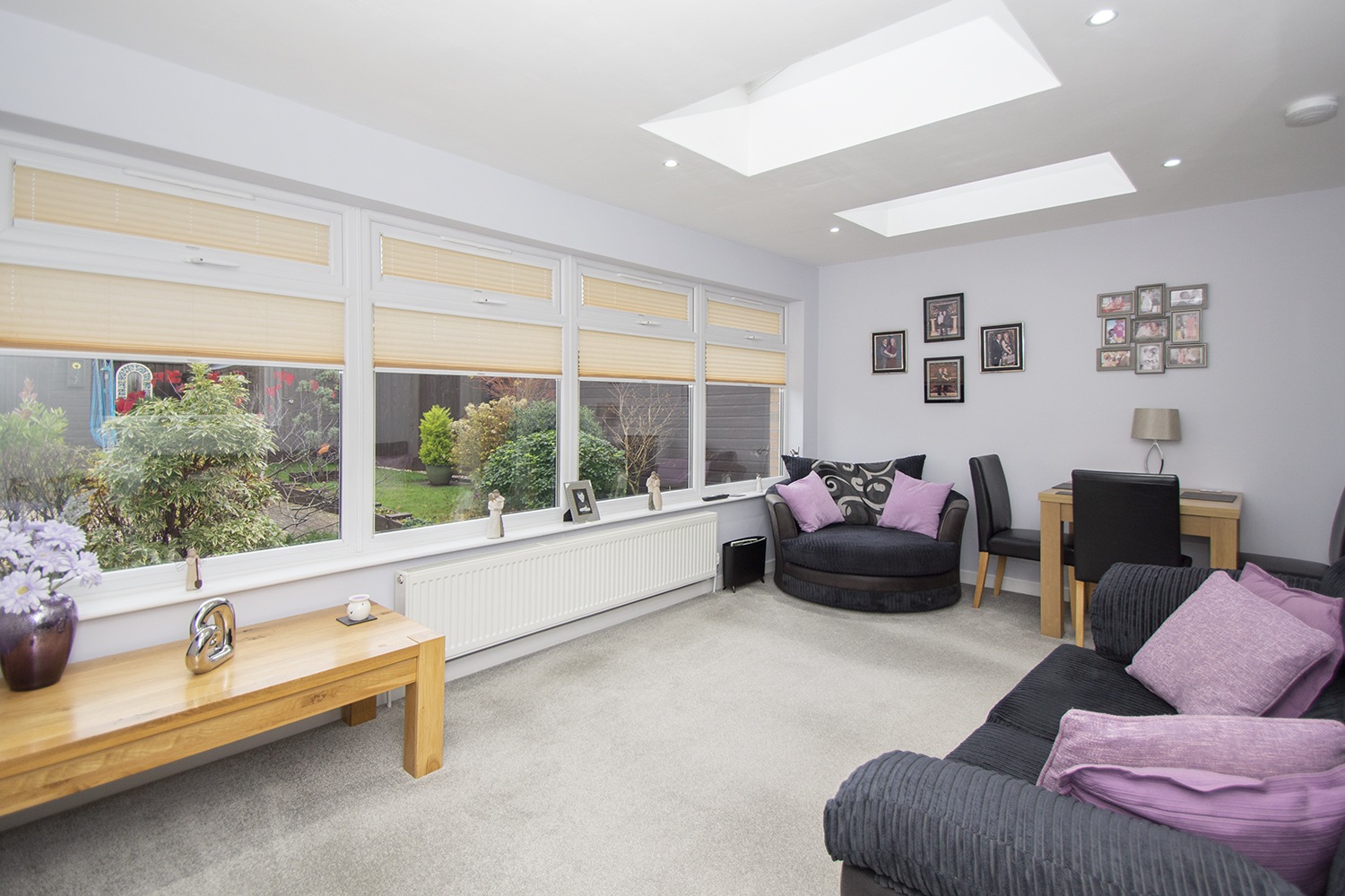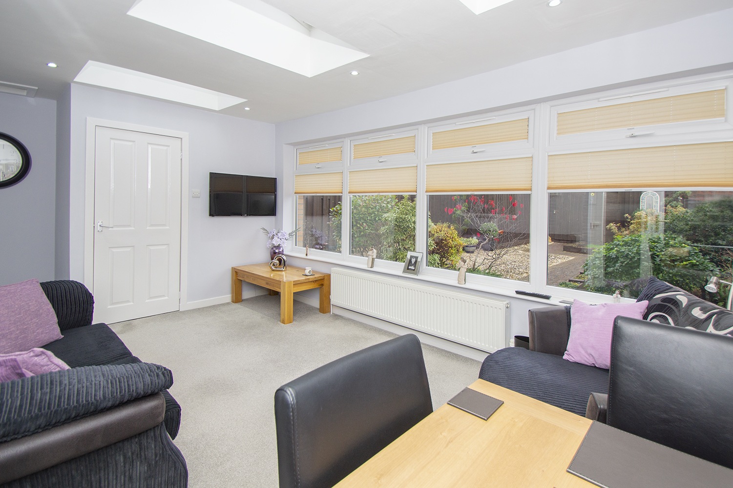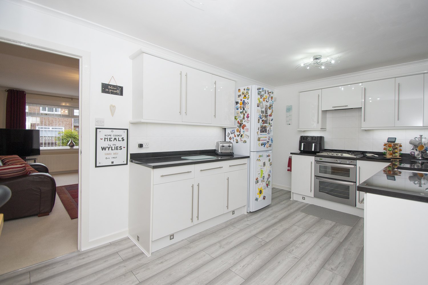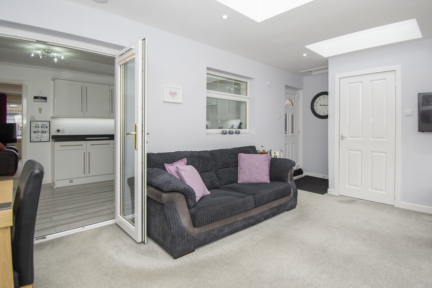 The property is immaculately presented throughout and is formed over two levels with the lower level comprising entrance hall which leads to the well-proportioned front facing lounge. Contemporary fitted kitchen which houses an ample range of base and wall units with complementary worktops and tiled splash-back areas, integrated appliances which include gas hob, double electric oven, extractor hood, dishwasher and washing machine, large storage cupboard. French doors from the kitchen open to the versatile family/dining room with wall-to-wall rear facing windows and skylights which allow an abundance of natural light to flow through. Two-piece WC. The upper-level accommodation houses the two well-proportioned double bedrooms with double fitted wardrobes and a further single bedroom with storage cupboard. Three-piece shower room comprising wc, wash hand basin and double shower cubicle with thermostatic shower.