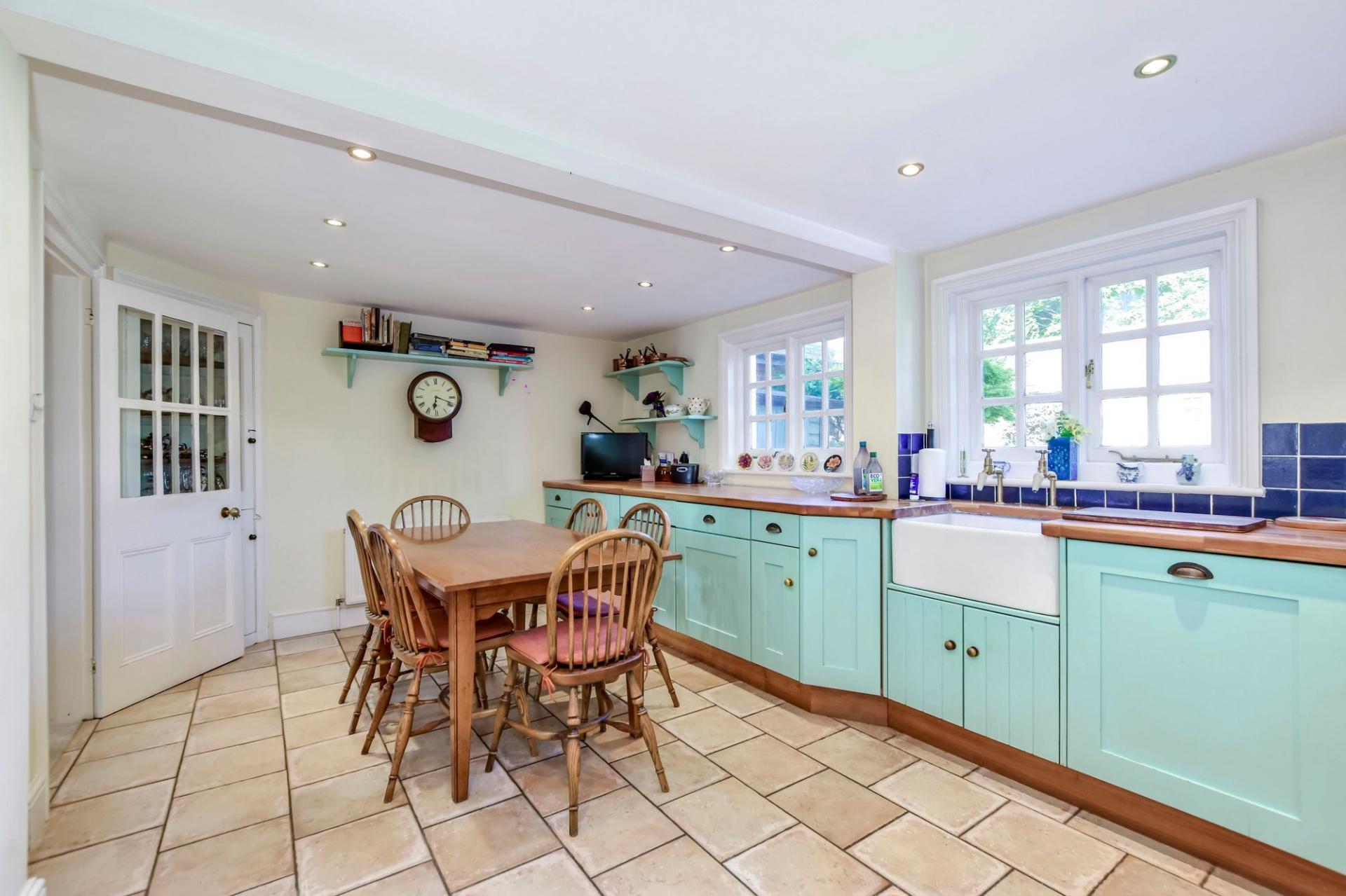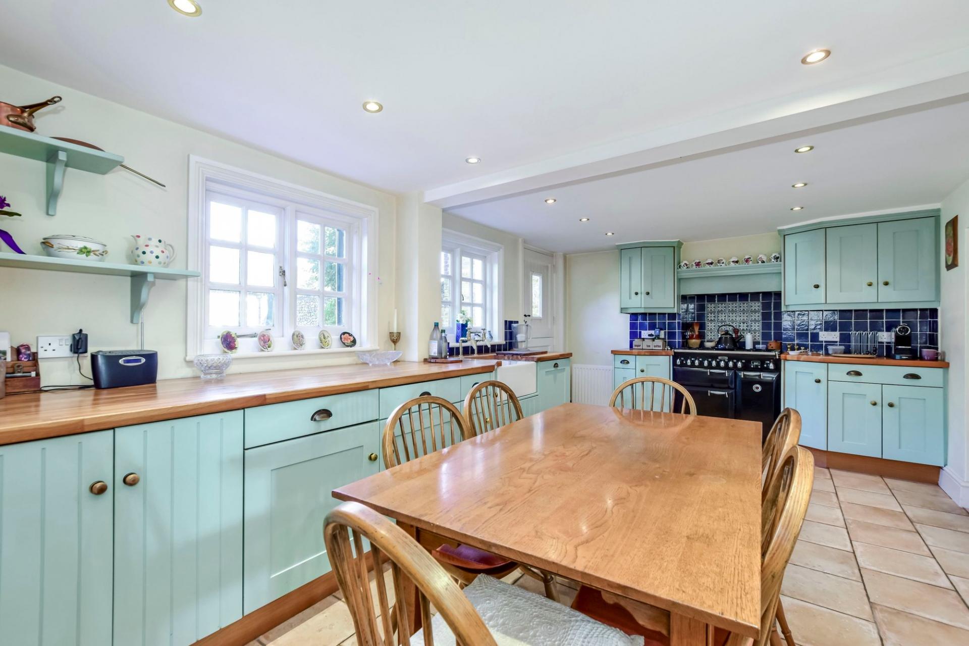 Entering on the ground floor to a welcoming entrance hall, you are taken in to a comfortable sitting room, which boasts an open fireplace, wood panelling and a wonderful outlook through the traditional wooden sash windows. To the rear of the property is a spacious country style kitchen-diner, which offers a range of cupboards, wooden worktops and a Butler style sink. Additionally there are a number of integrated appliances, as well as a Range style cooker.