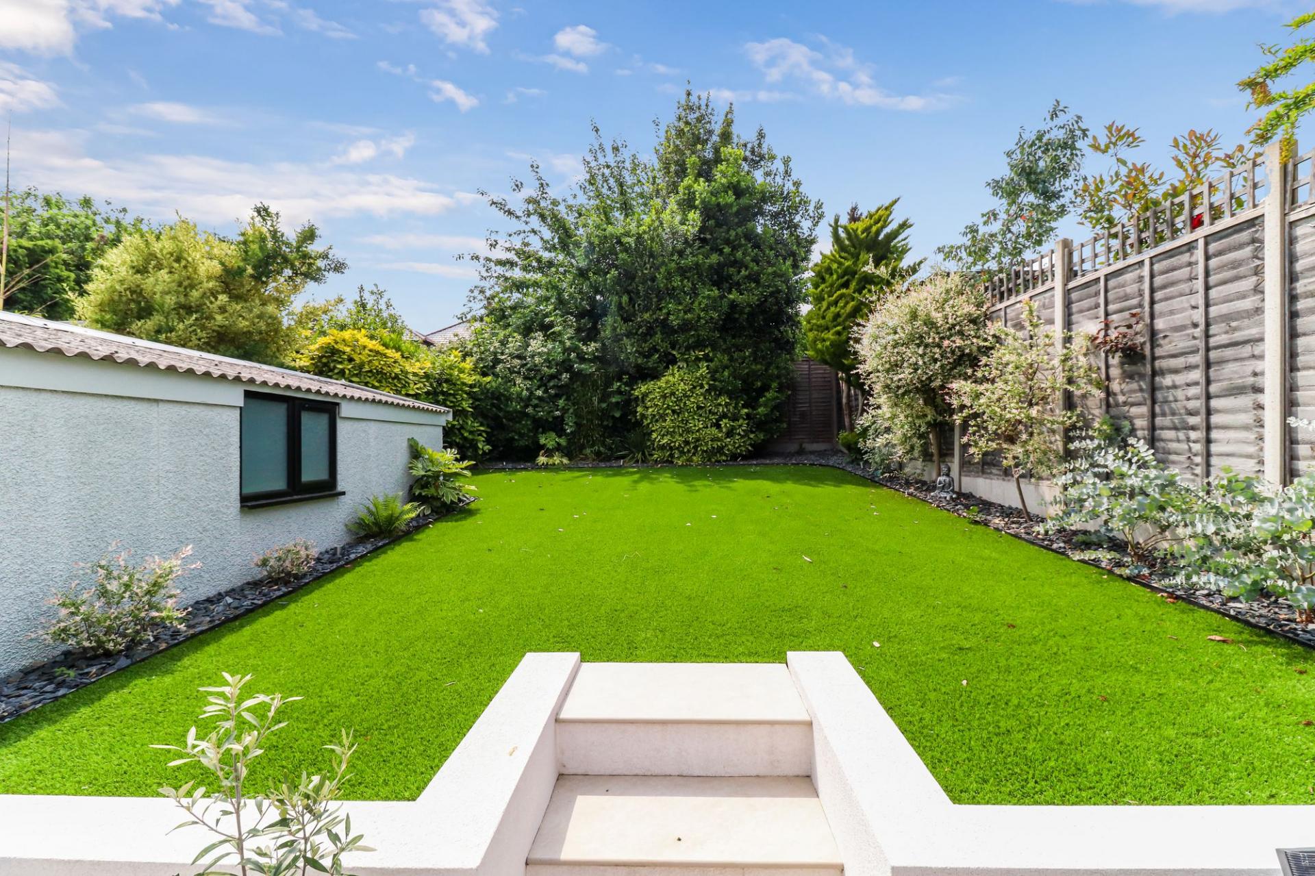 Externally, the low maintenance West-facing rear garden has been fully landscaped and boasts a lovely and spacious patio area, as well as a neat and tidy artificial lawned area. Additionally, there is a detached outbuilding which could easily be used as a home office or gym. Side access leads you to the front of the house, where there is a driveway for multiple vehicles.