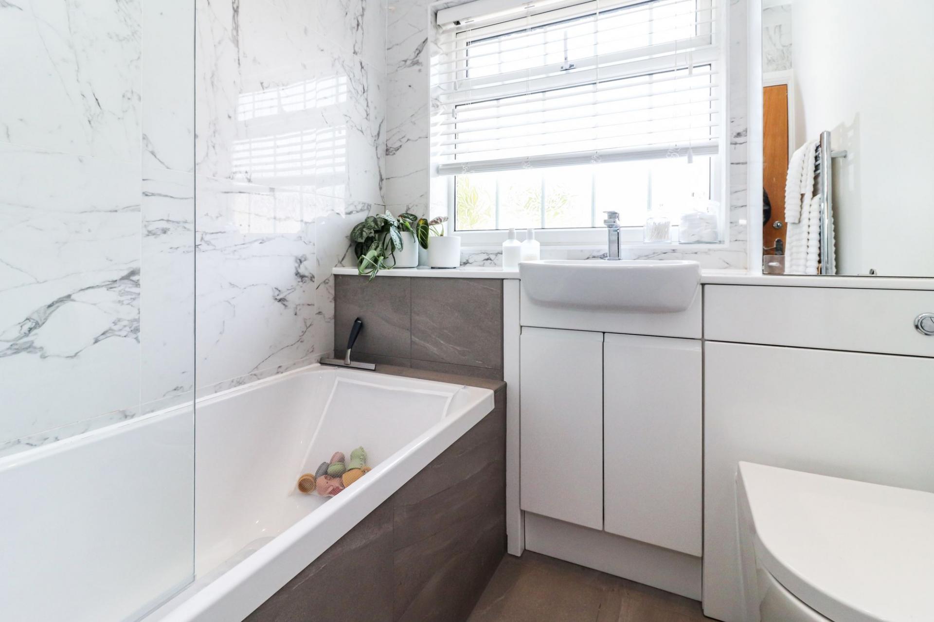 There are 2 double bedrooms, with the larger of the 2 benefitting from fitted wardrobes and a lovely bay window, complete with wooden shutters. The bedrooms are serviced by a family bathroom, which has been refitted with large marble tiles and a modern suite.