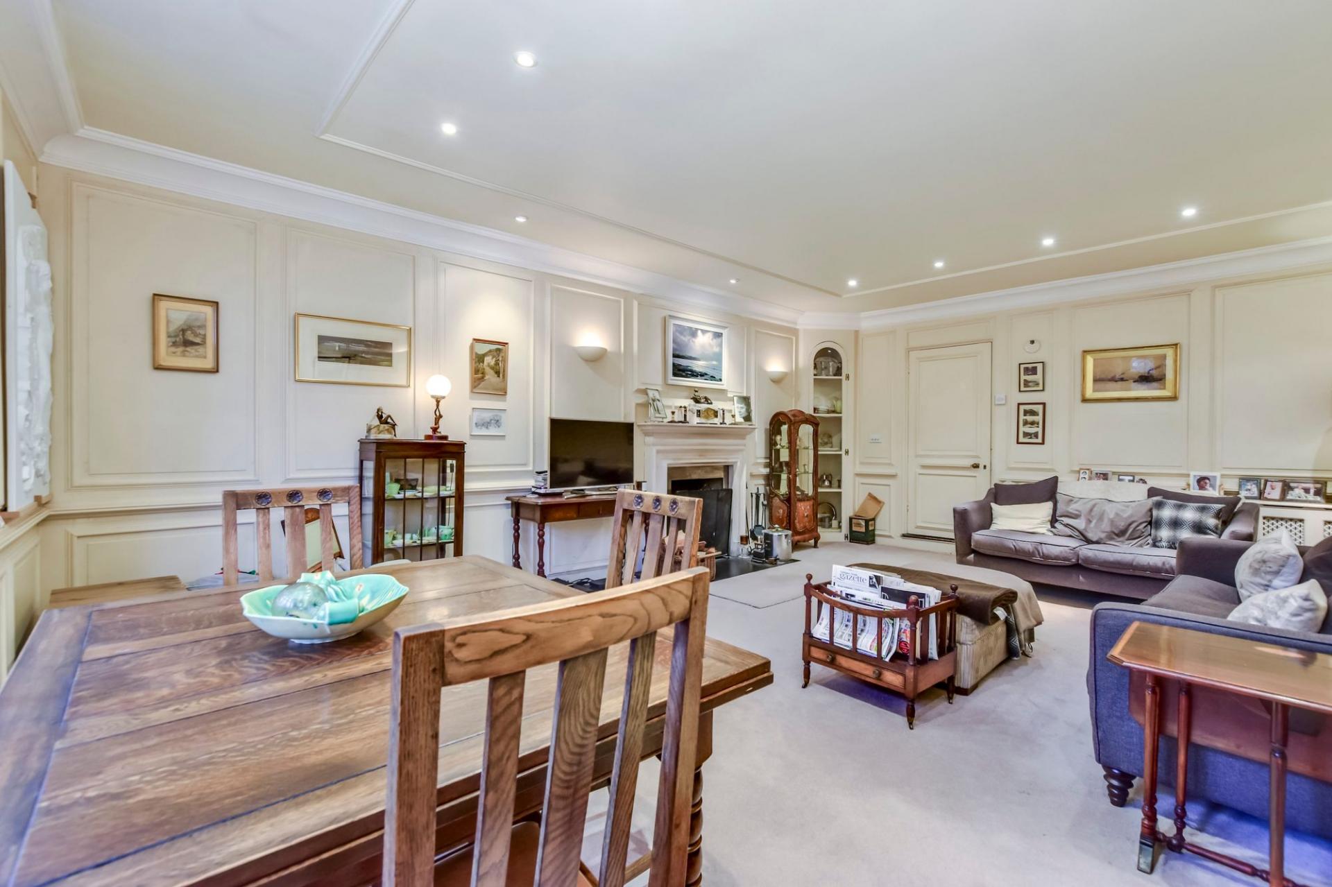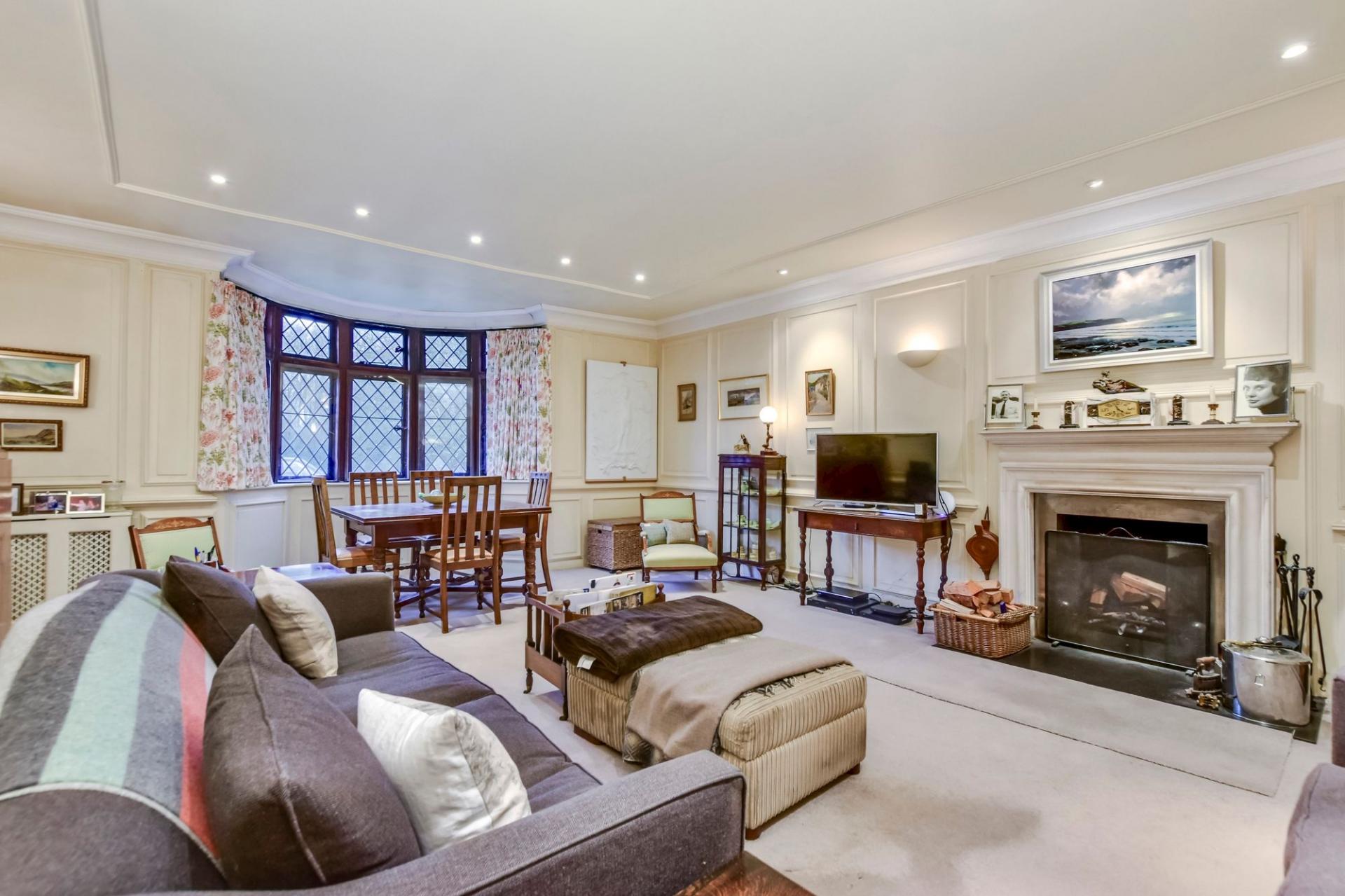 The generous main reception room is both comfortable and quiet, offering ample space for formal seating alongside a sunny dining area within the bay window at the front of the room. Wall panelling and an open fireplace continue the home’s rich character.