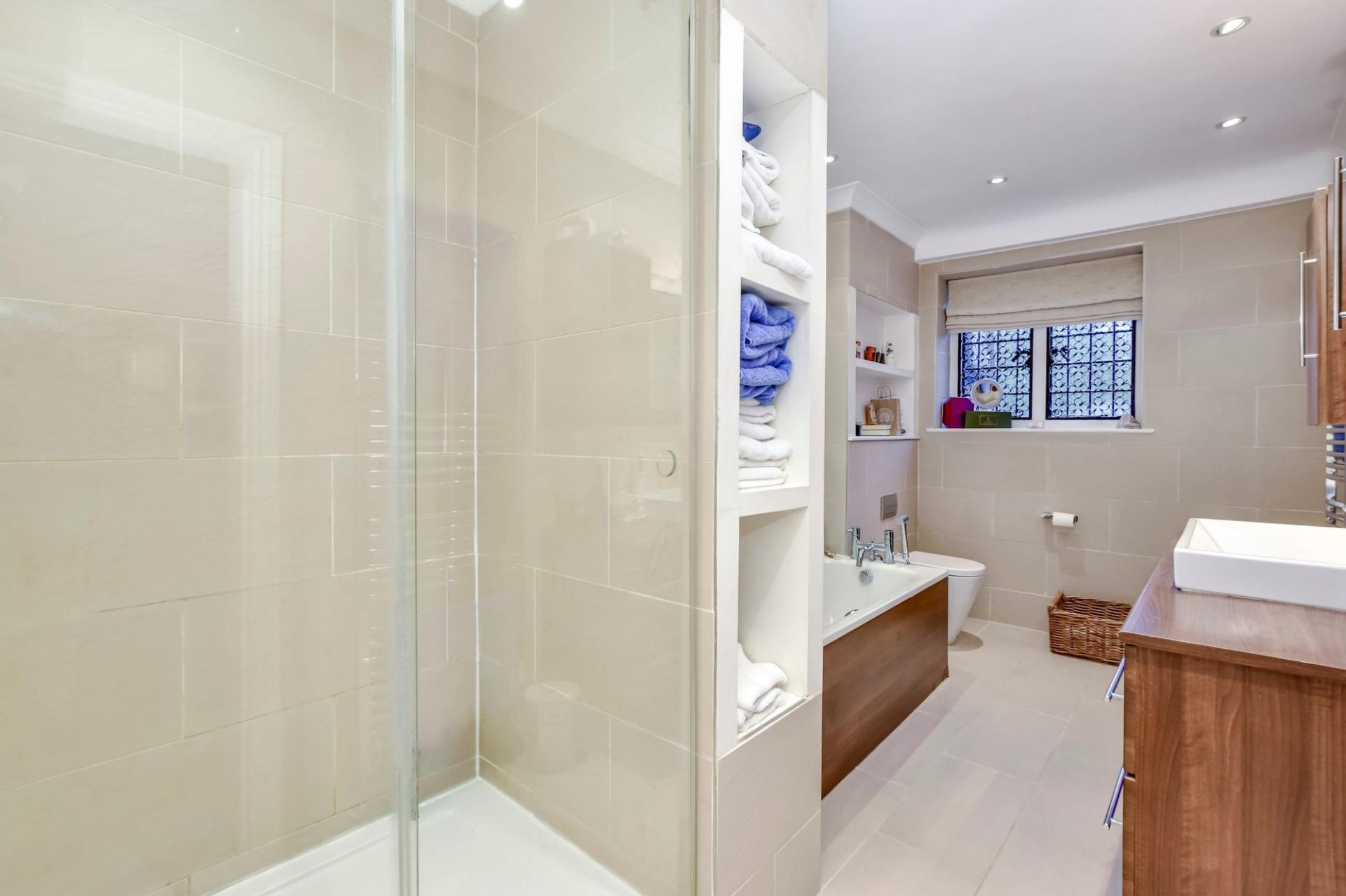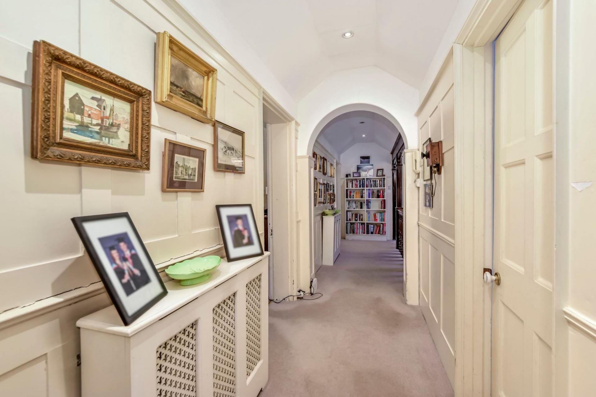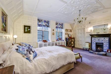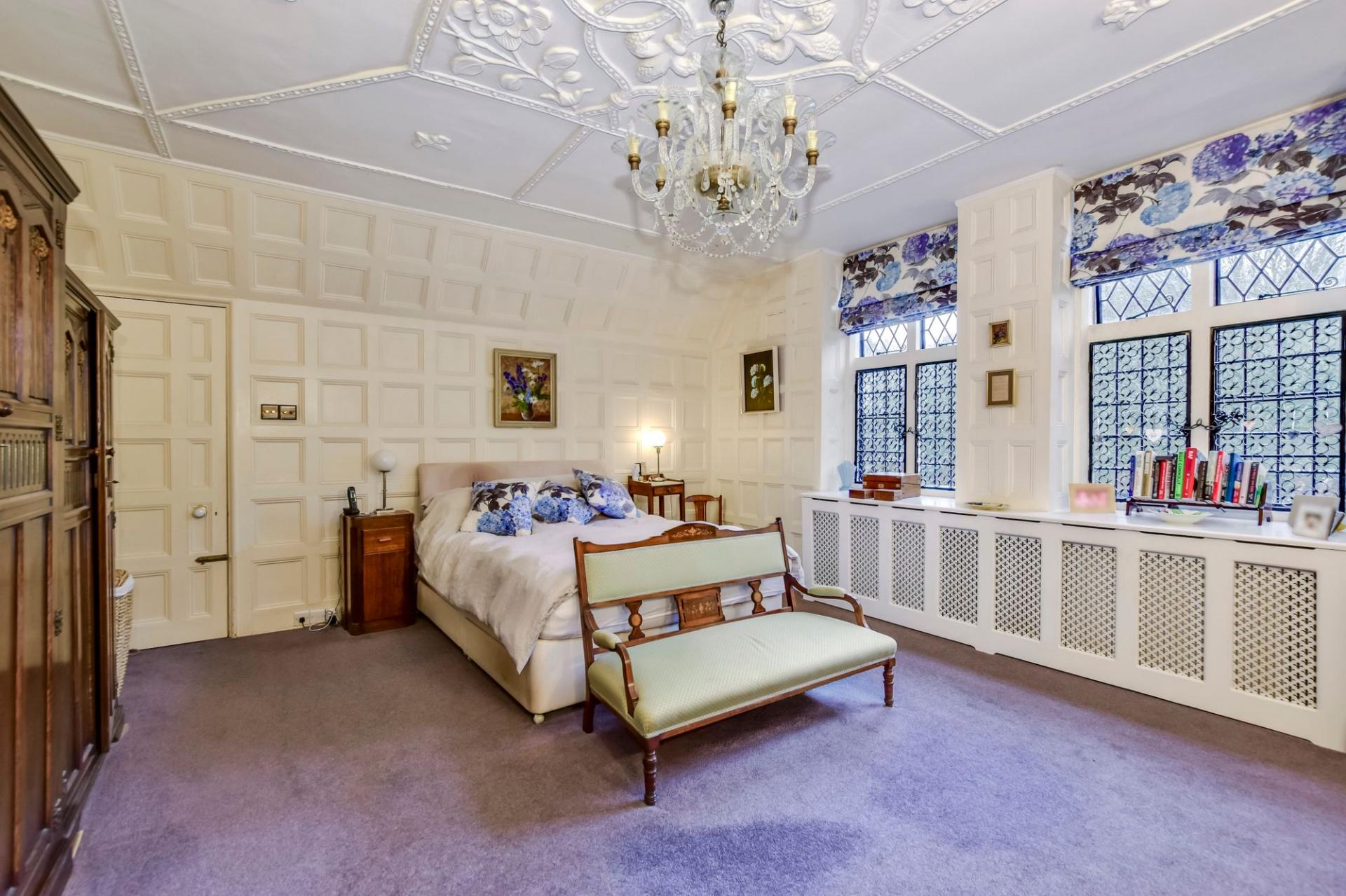 On the first floor, two of the bedrooms feature an interconnecting door and are currently used as individual rooms. One could easily serve as a luxurious dressing room if desired. Both rooms showcase exquisite detailing, with intricate wall panelling and ceiling mouldings that, while not as old as they appear, create a truly one-of-a-kind atmosphere. The principal bedroom also benefits from authentic Delft tiles within the fireplace surround, adding genuine historical integrity, along with a spacious en-suite bathroom featuring a separate shower and bathtub, and verdant views through leaded windows.