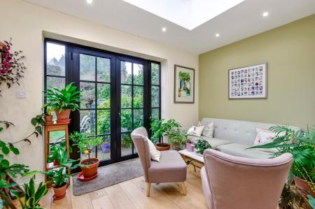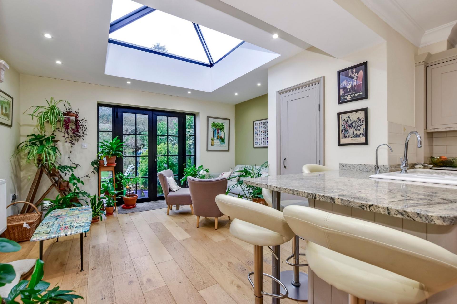 A kitchen extension completed a few years ago has created a space that is very much the heart of the home. Its wide proportions accommodate a practical and thoughtfully arranged kitchen, featuring granite worktops, extensive storage above and below, and a breakfast bar that defines the open-plan dining area. This space is currently used as a relaxed lounge, filled with natural light courtesy of an oversized atrium above.