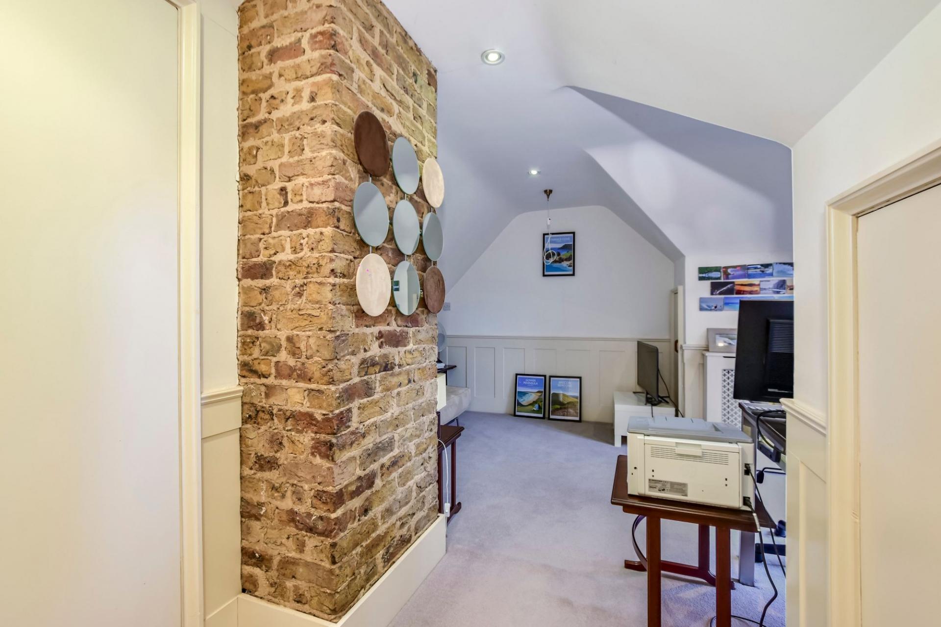 A further staircase leads to what feels like a self-contained apartment on the top floor. Two double bedrooms sit either side of a generous landing and a large shower room, all positioned beneath vaulted ceilings that enhance the character of the space, complemented by exposed brickwork. One bedroom also enjoys access to a private balcony with garden views.