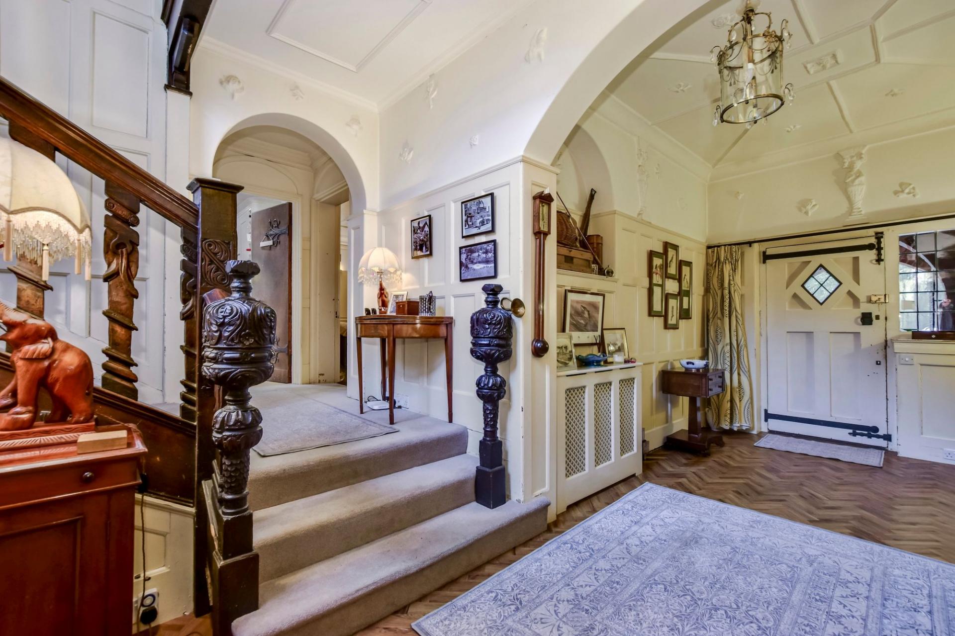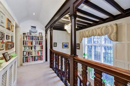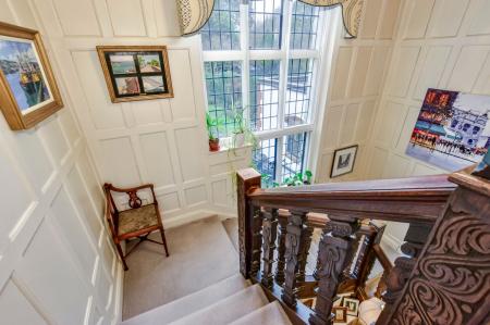 Inside, an exquisitely carved oak staircase curves upward to an imposing galleried landing, where shadowed timber beams stretch overhead. Midway up the staircase, a magnificent leaded window set into the panelled wall casts luminous patterns across the descending steps.