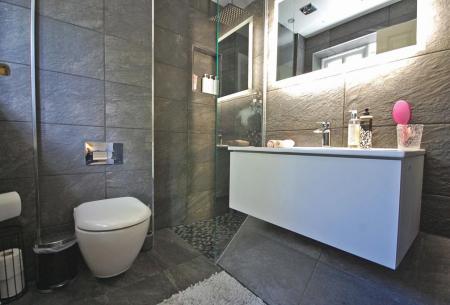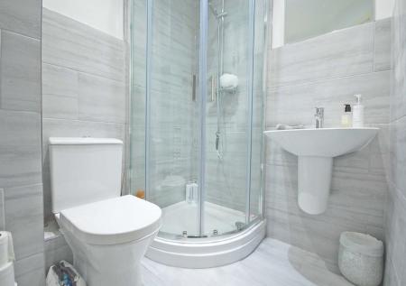 Opaque double glazed window to front aspect, fully tiled shower, low level WC, inset wash hand basin, heated towel rail, extractor fan, tiled flooring with underfloor heating and smooth ceiling with sunken spotlights.