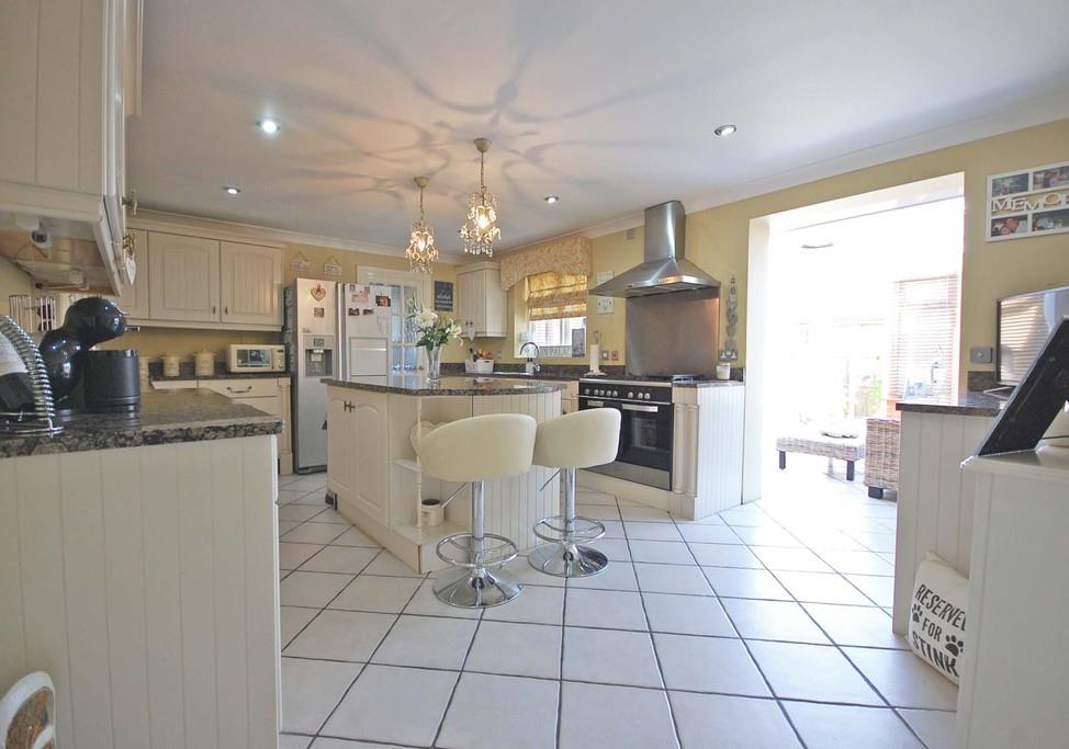 Double glazed window to rear aspect, a series of matching base and wall units, granite work surfaces incorporating single bowl sink with central mixer tap, cooker with six ring gas hob and extractor hood over, space for fridge/freezer, inset wine rack, integrated dishwasher, floating island with further storage units, tiled flooring and smooth coved ceiling with sunken spotlights. Open arch to conservatory and access to utility room.