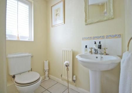 Double glazed opaque window to front aspect fitted with wooden shutters, low level WC, pedestal wash hand basin, radiator, tiled flooring and textured ceiling.