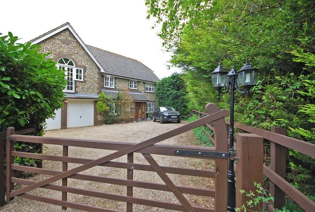 The property frontage is privatised by woodland to front view and various mature tree borders to sides. Shingle driveway with gated access to rear garden.