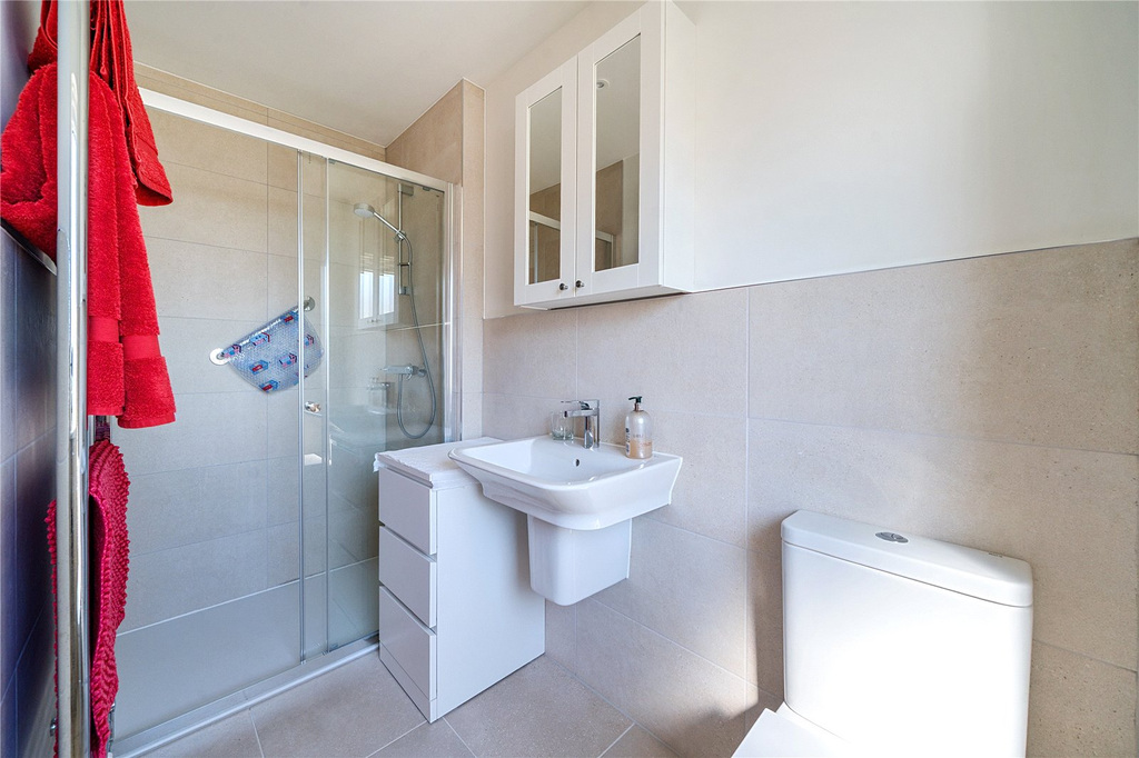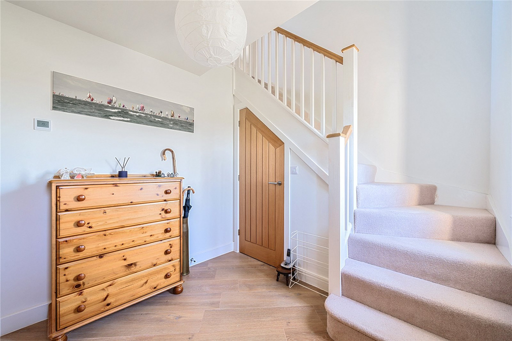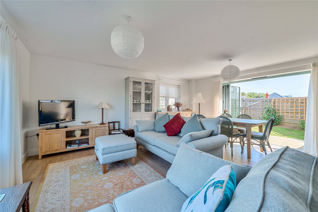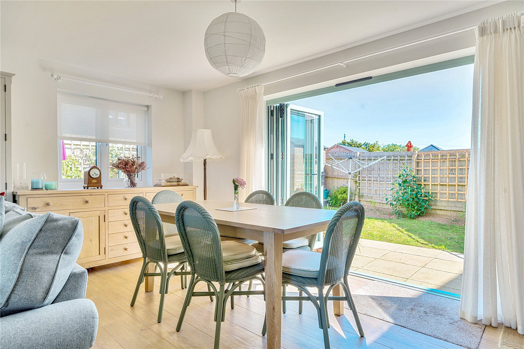 The spacious entrance hall provides stairs to the first floor, storage beneath and a guest cloakroom. The bright and inviting sitting/dining room, has a triple aspect with bi-fold doors leading out to the garden. The contemporary kitchen leads off, with a rear aspect looking out over the garden, fitted with an array of matching base and wall units, with an electric oven and hob, and space for appliances.