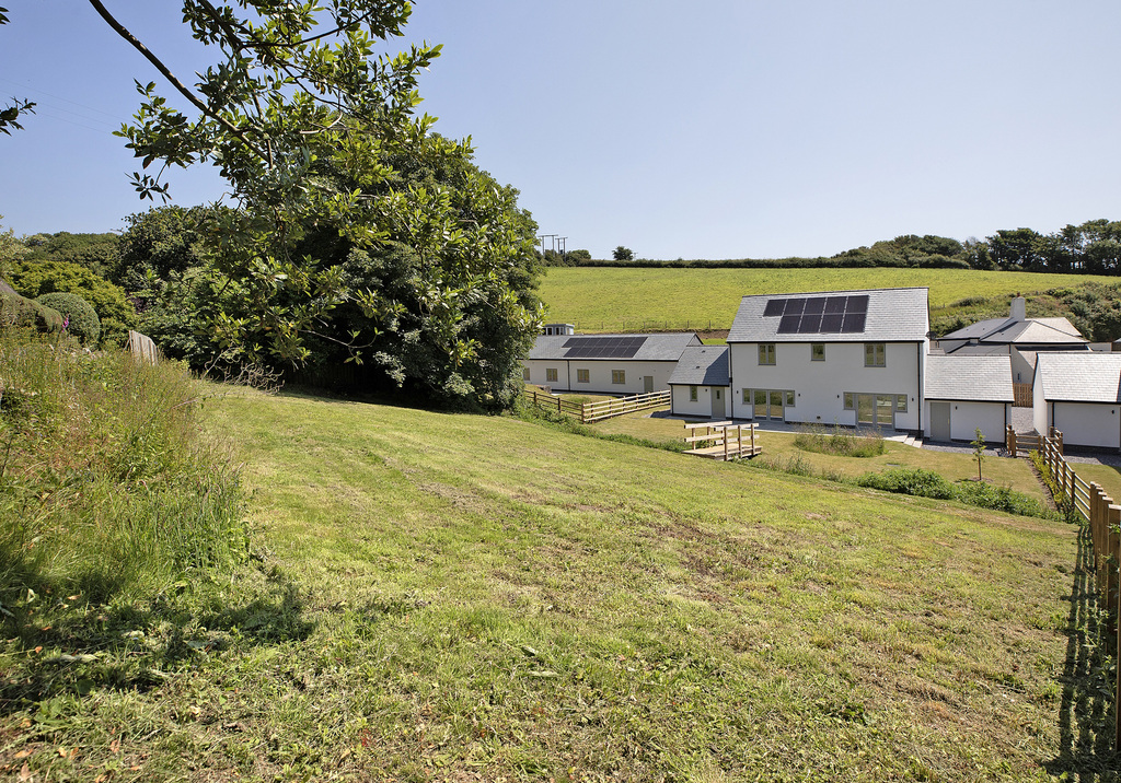 - Garden with bridge over the stream to a larger sloping lawned garden
