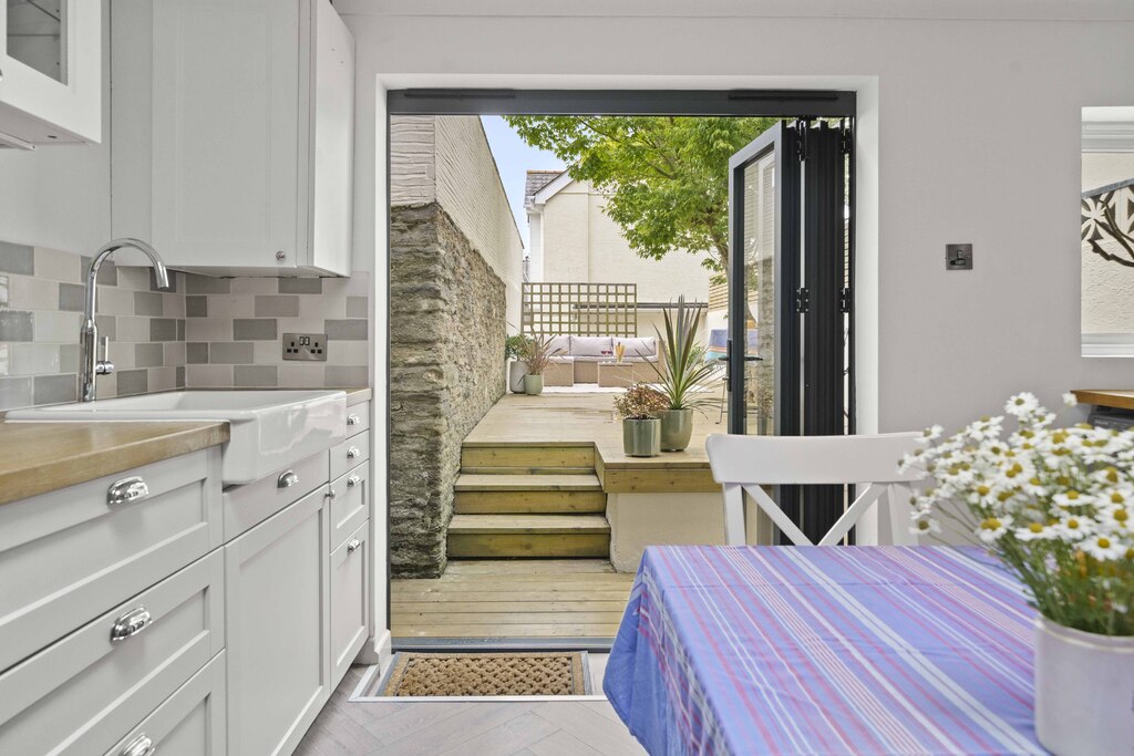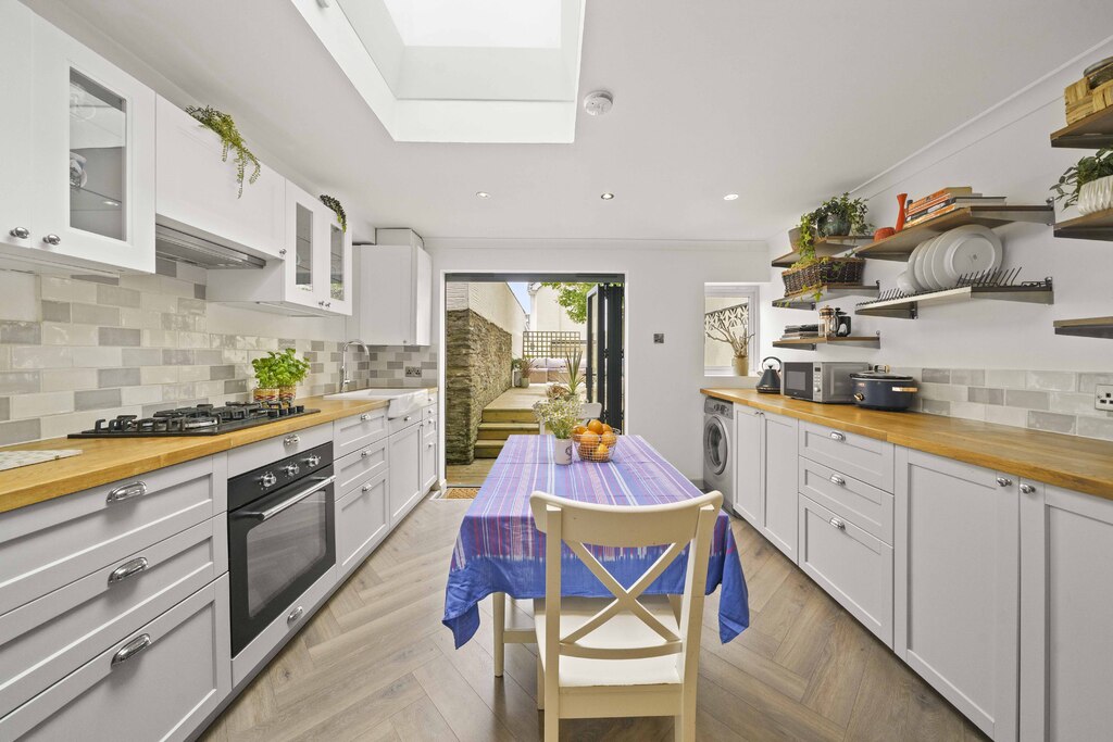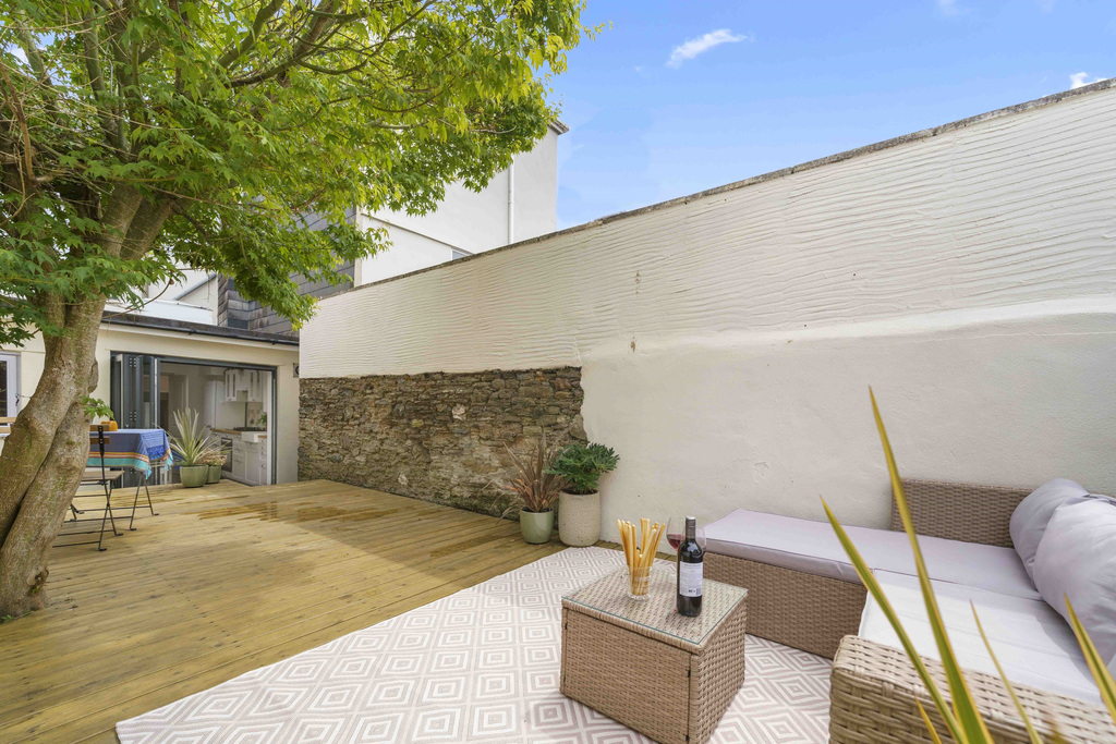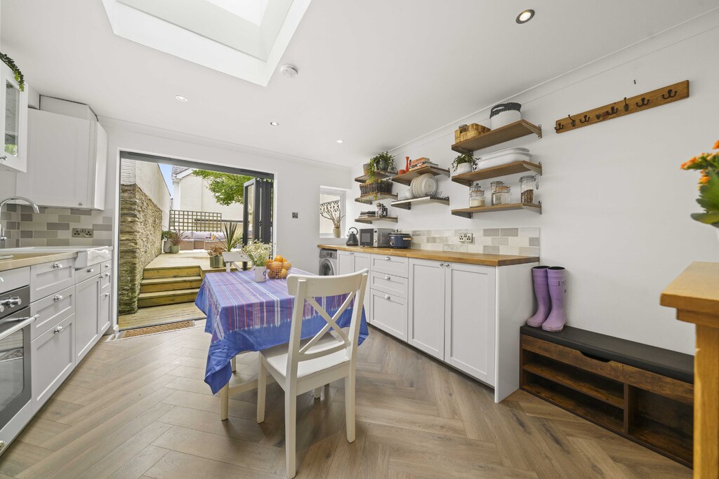 There is a shared entrance hall with full right of access into the property. Inside the accommodation is arranged over 3 floors and comprises spacious living room with views out to Fore Street, superb kitchen extension with plenty of modern floor and wall units, integrated appliances, sky light and bifold doors opening to the private, enclosed timber decked garden. This is a fantastic place to entertain or simply sit and unwind.