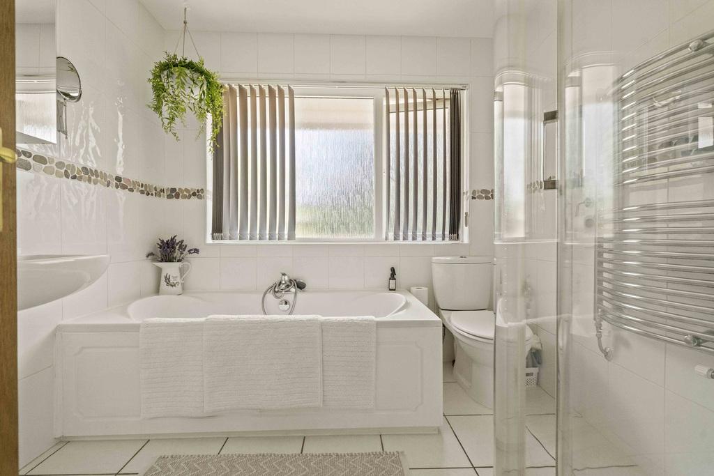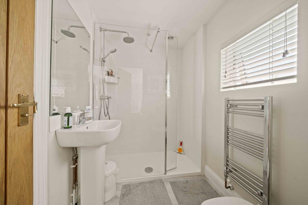 There is a well-appointed family bathroom with both bath and separate shower plus a