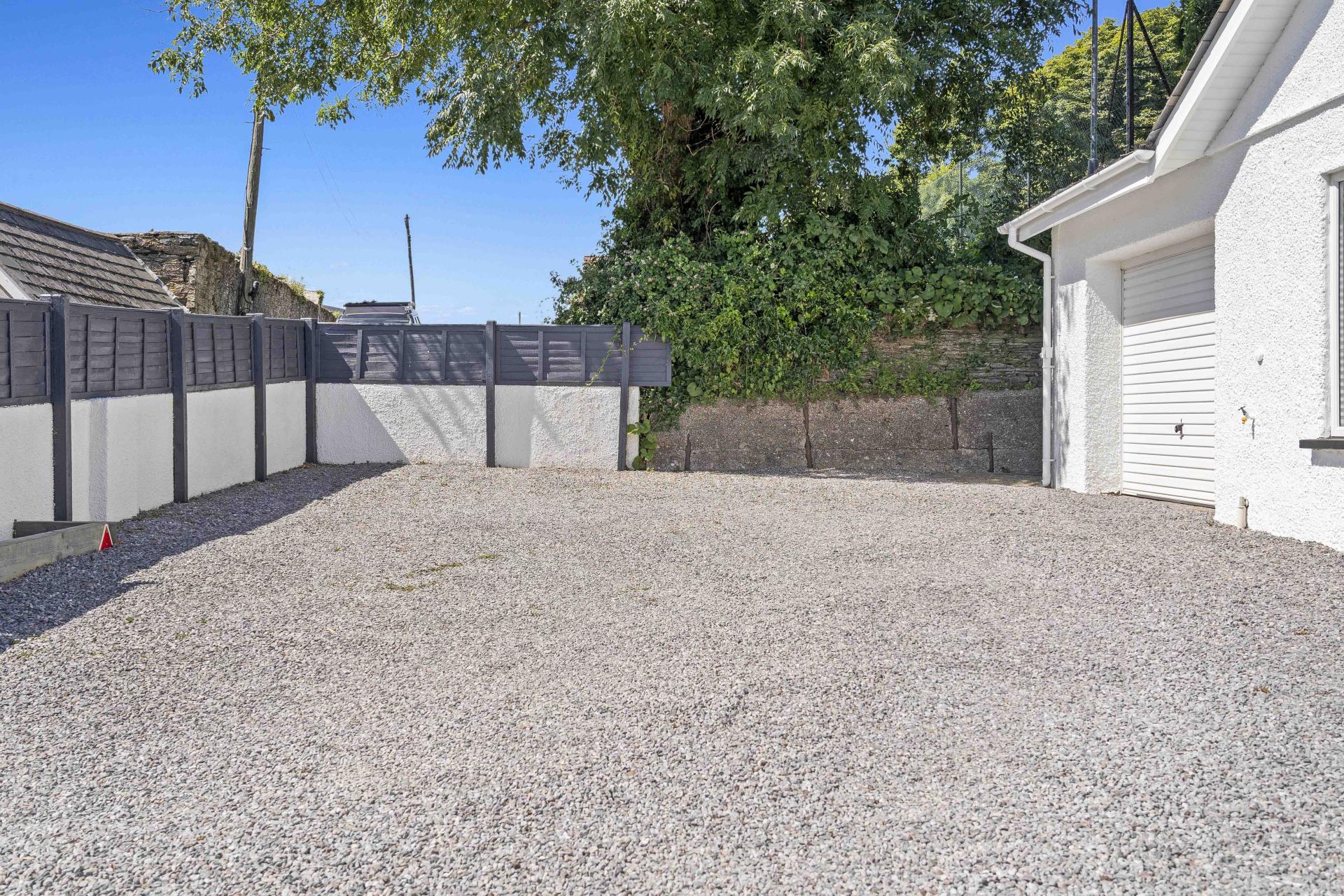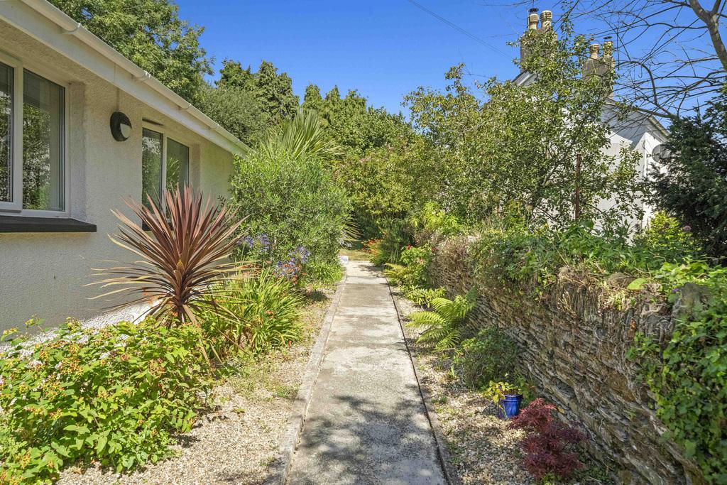 pathway with planted borders on either side to the rear garden. There is a large covered