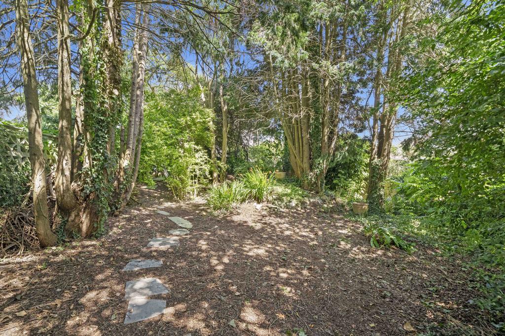 shrubs, trees and bushes bordering the edges. At the top of the garden is a slate slab