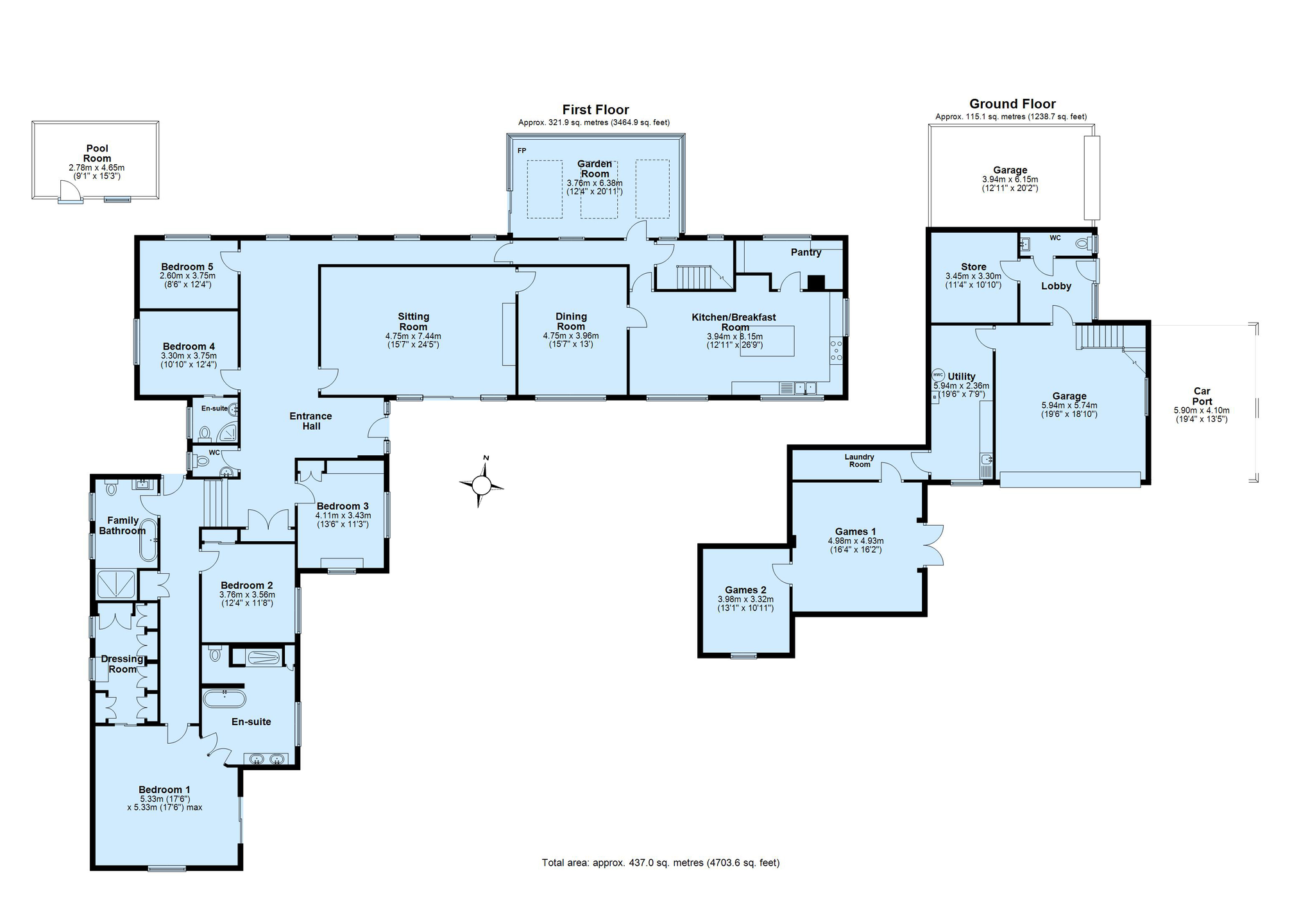 Adjacent to the kitchen is a stairway down to the double garage, storeroom, gardeners’ cloakroom, plant and utility room, laundry and two games rooms. Should the new homeowners ever have a need for a lift, the location of these stairs would be an obvious choice to install one. Several doors lead out to the single garage and car port.