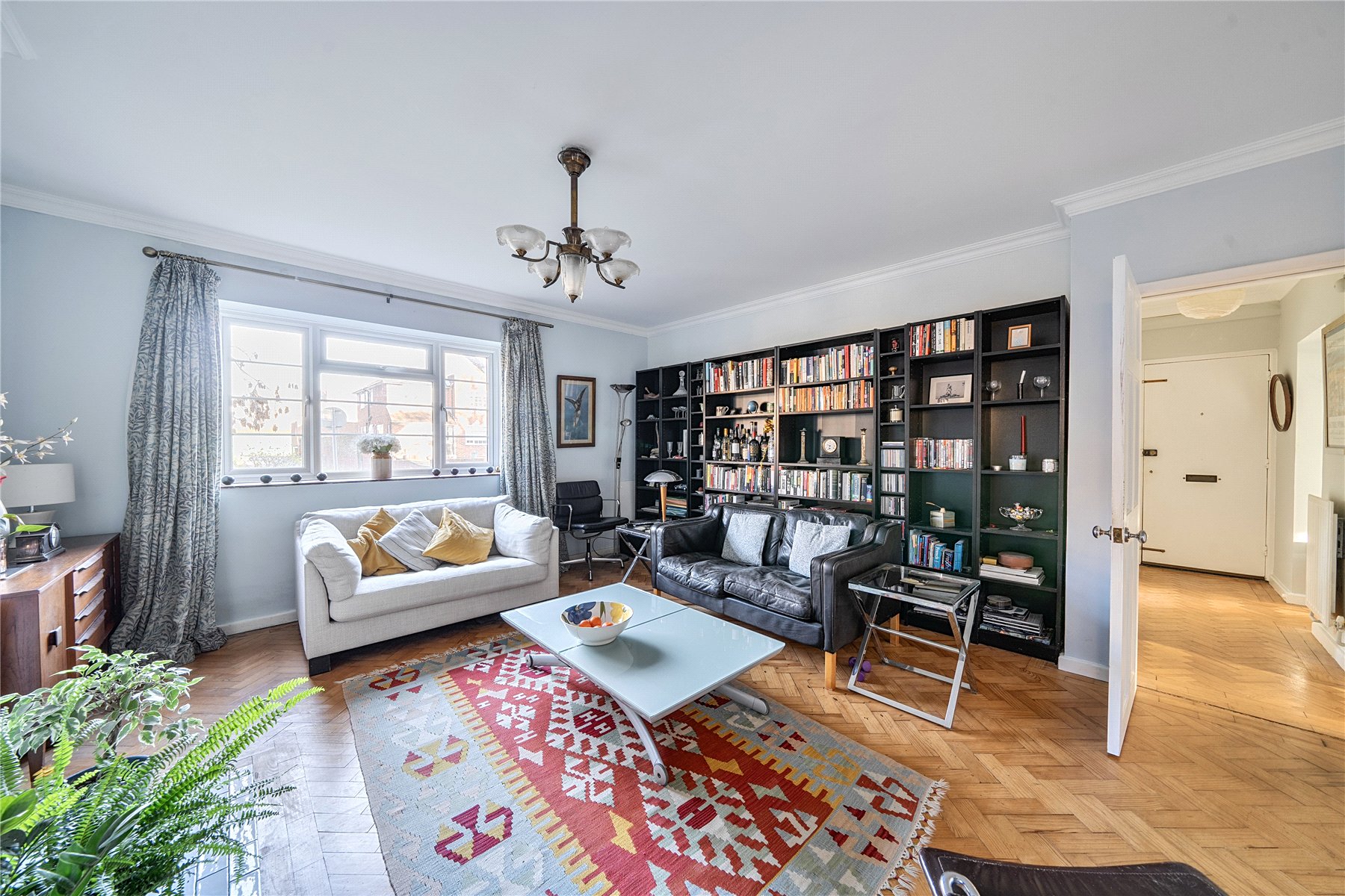 - Spacious Living Room with Parquet Flooring
