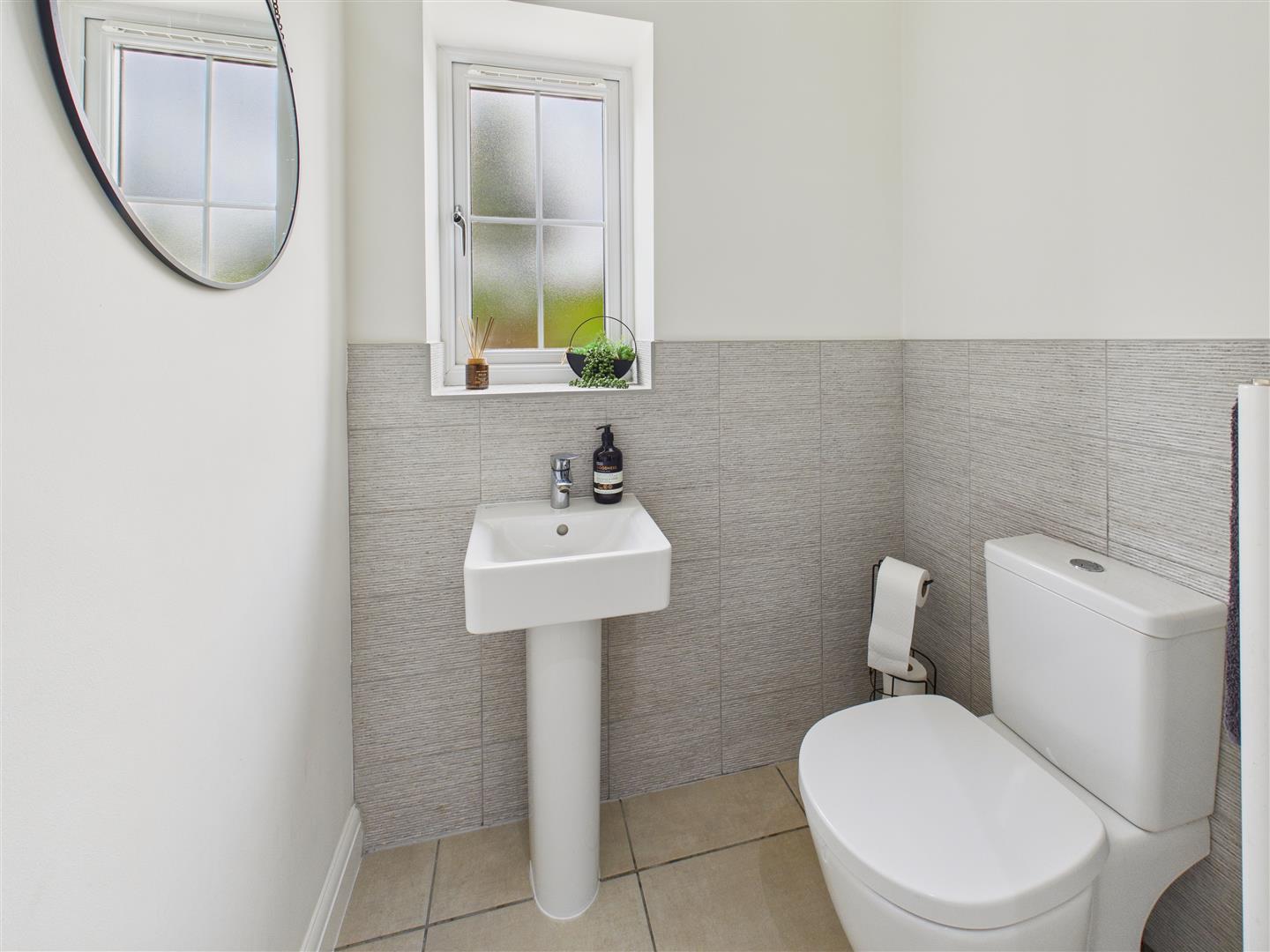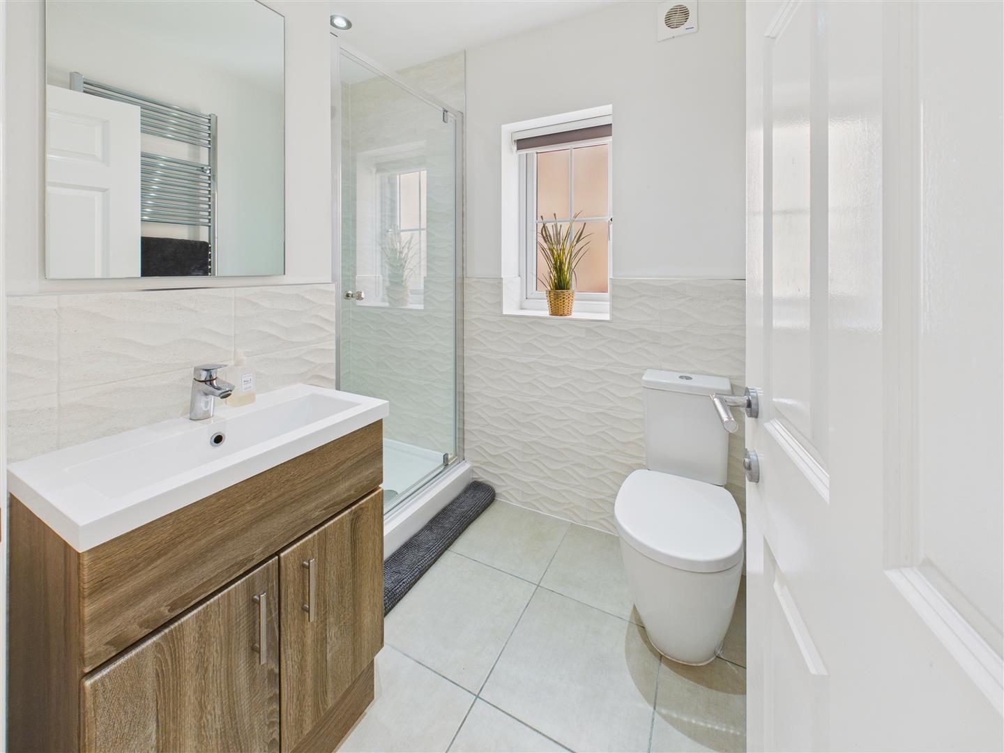 En-Suite Shower Room - With suite comprising a shower enclosure, wash hand basin and low flush W.C. Part tiling to walls, tiled floor, heated towel rail and window to side.