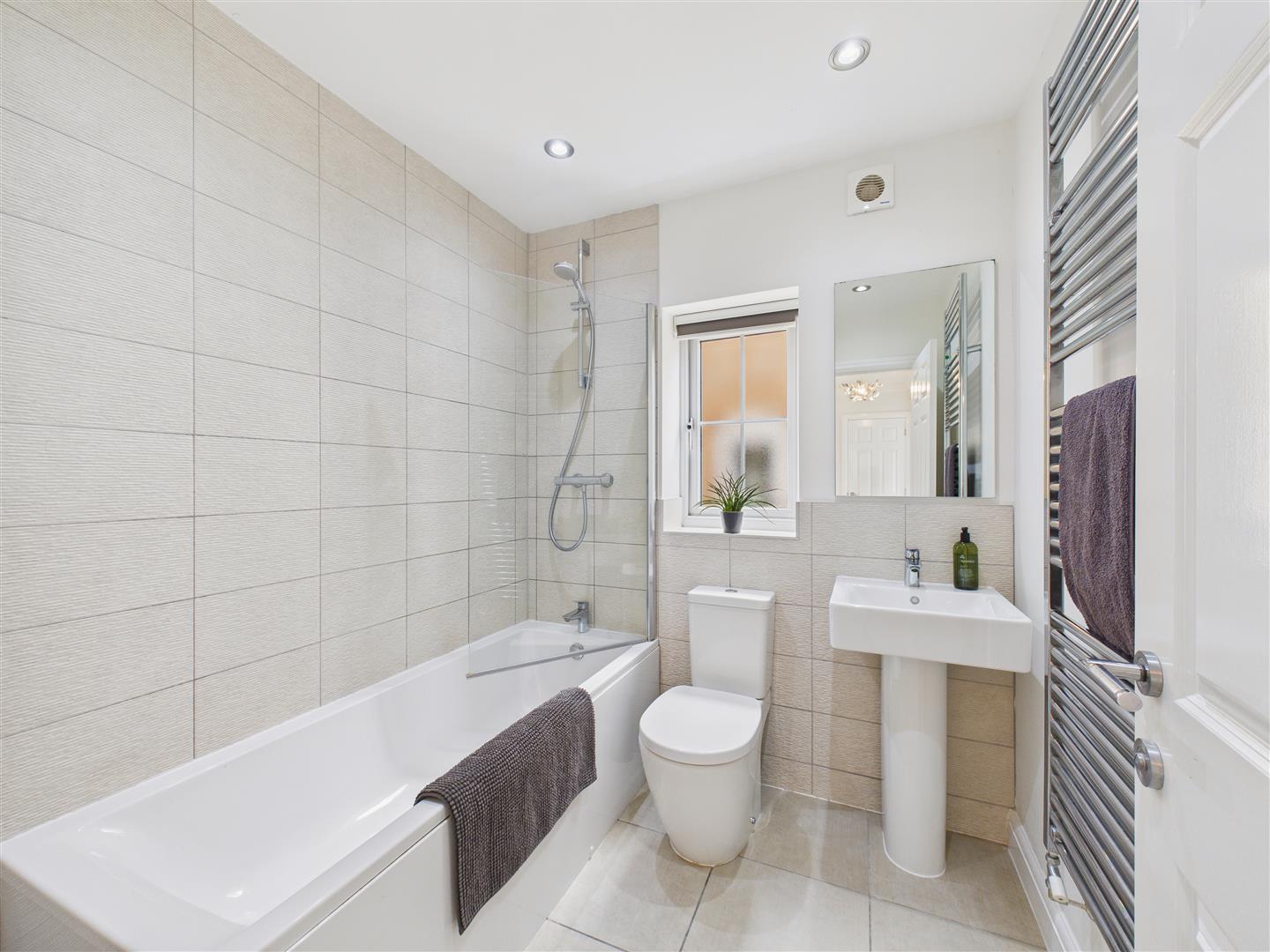Bathroom - With suite comprising a bath with shower over and screen, wash hand basin and low flush W.C. Part tiling to walls, tiled floor, inset spot lights, heated towel rail and window to side.