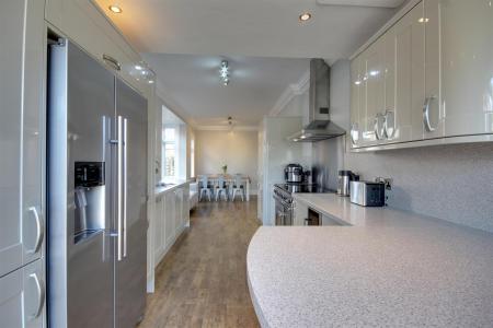 Dining Kitchen - 9.47m x 3.99m approx (31'1" x 13'1" approx) - A super room with bay window to side elevation and windows with central double doors opening out to the rear terrace. There is plenty of space for dining suite and settee etc. The kitchen features a range of high gloss fronted base and wall mounted units with work surfaces, sink and drainer with mixer tap, range cooker with stainless steel splashback and extractor hood above, dishwasher.