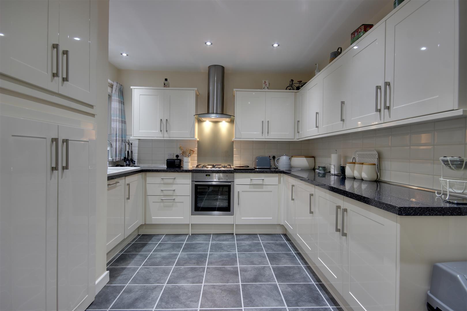 Kitchen - 4.01m x 2.44m approx (13'2" x 8'0" approx) - Having an extensive range of fitted high gloss fronted units with work surfaces, ceramic one and a half sink and drainer, integrated oven, four ring gas hob, extractor hood above, dishwasher and fridge. Recessed spot lights to ceiling, window to rear elevation, useful storage cupboard. The room has double doors leading through to the living/dining/bed 3.