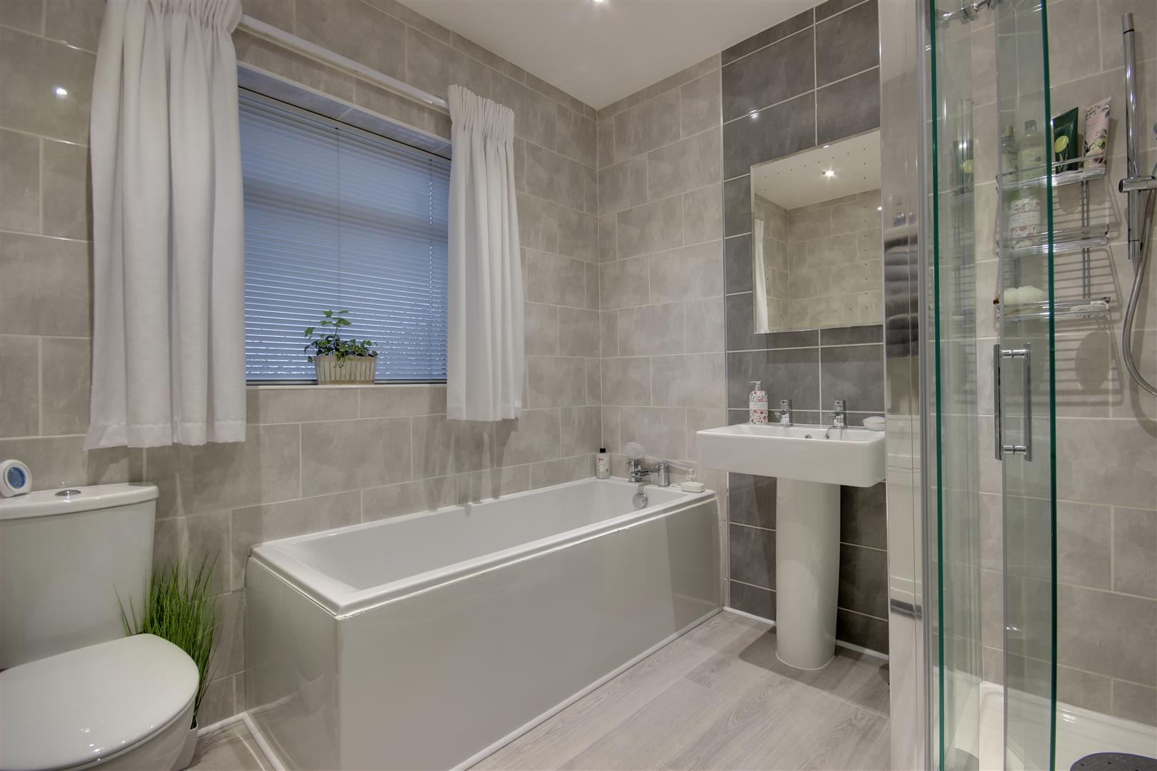 Bathroom - Having a stylish bathroom comprising low level W.C., pedestal wash hand basin, panelled bath, separate shower cubicle, tiling to the walls, heated towel rail.