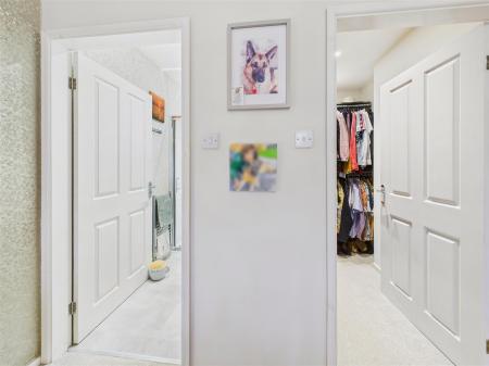 Bedroom 1 - Offering a touch of luxury with fitted wardrobes, a walk in wardrobe fitted with hanging rails and shelving plus an en-suite shower room. Bow window to the front elevation.