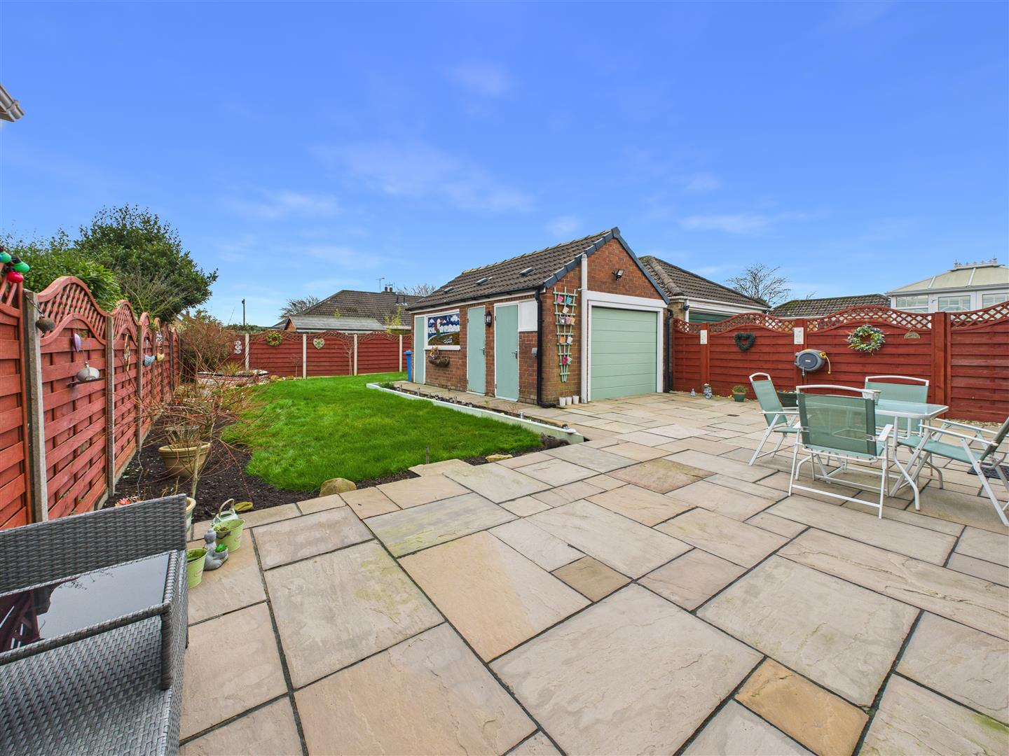 Outside - Enjoying a desirable southerly orientation the garden is lawned with an extensive patio area positioned to capture the best of the daily sun. A driveway to the front and side leads to secure gates and a single garage, providing excellent security and parking.