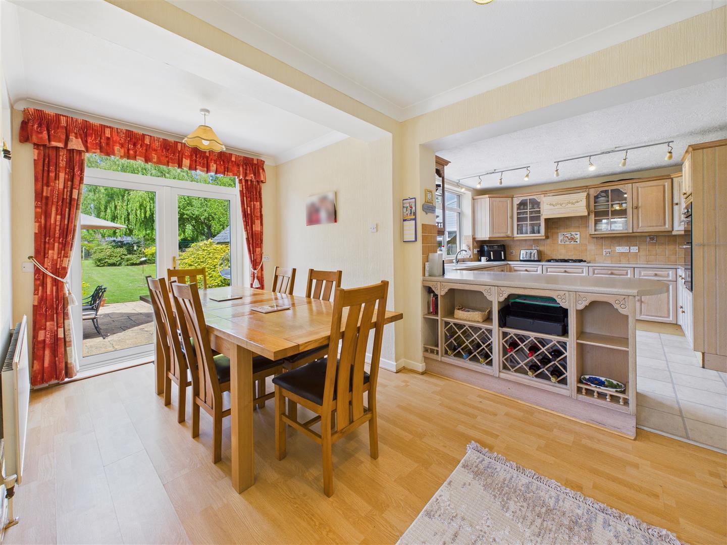 Dining Kitchen - An open plan space overlooking the garden with window and double doors which open out to an extensive paved patio. The kitchen has a range of limed oak fitted units with work surfaces, integrated double oven, four ring gas hob, filter hood above, plumbing for a dishwasher, one and a half sink and drainer with mixer tap, tiled surround.