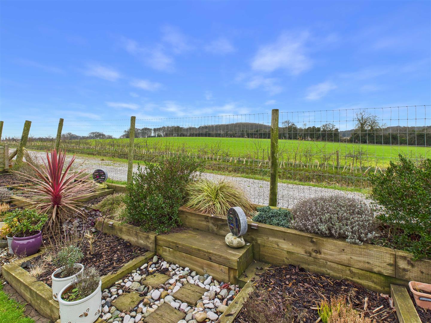 Outside - Externally, the property offers a lawned front garden with laurel hedging and a driveway leading to a detached double garage (currently configured with a rear section as a gym). The private rear garden is a true highlight, featuring a patio, lawn, raised planters, and stunning, uninterrupted open views.