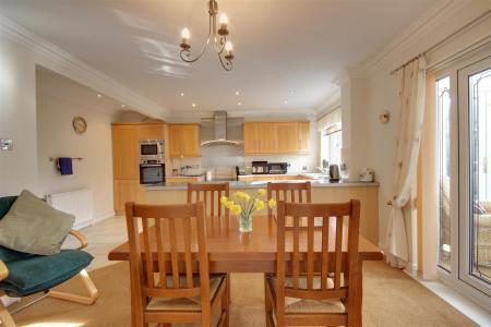 Dining Kitchen - 5.87m x 4.88m approx (19'3" x 16'0" approx) - An attractive room with an elevation to the west across the garden which allows light to flood in. The kitchen area has a range of fitted base and wall mounted units with work surfaces and integrated appliances include and oven, microwave, hob, extractor hood, dishwasher and fridge freezer. There is a one and a half sink and drainer, tiling to the floor. Within the dining area double doors open through to the conservatory.