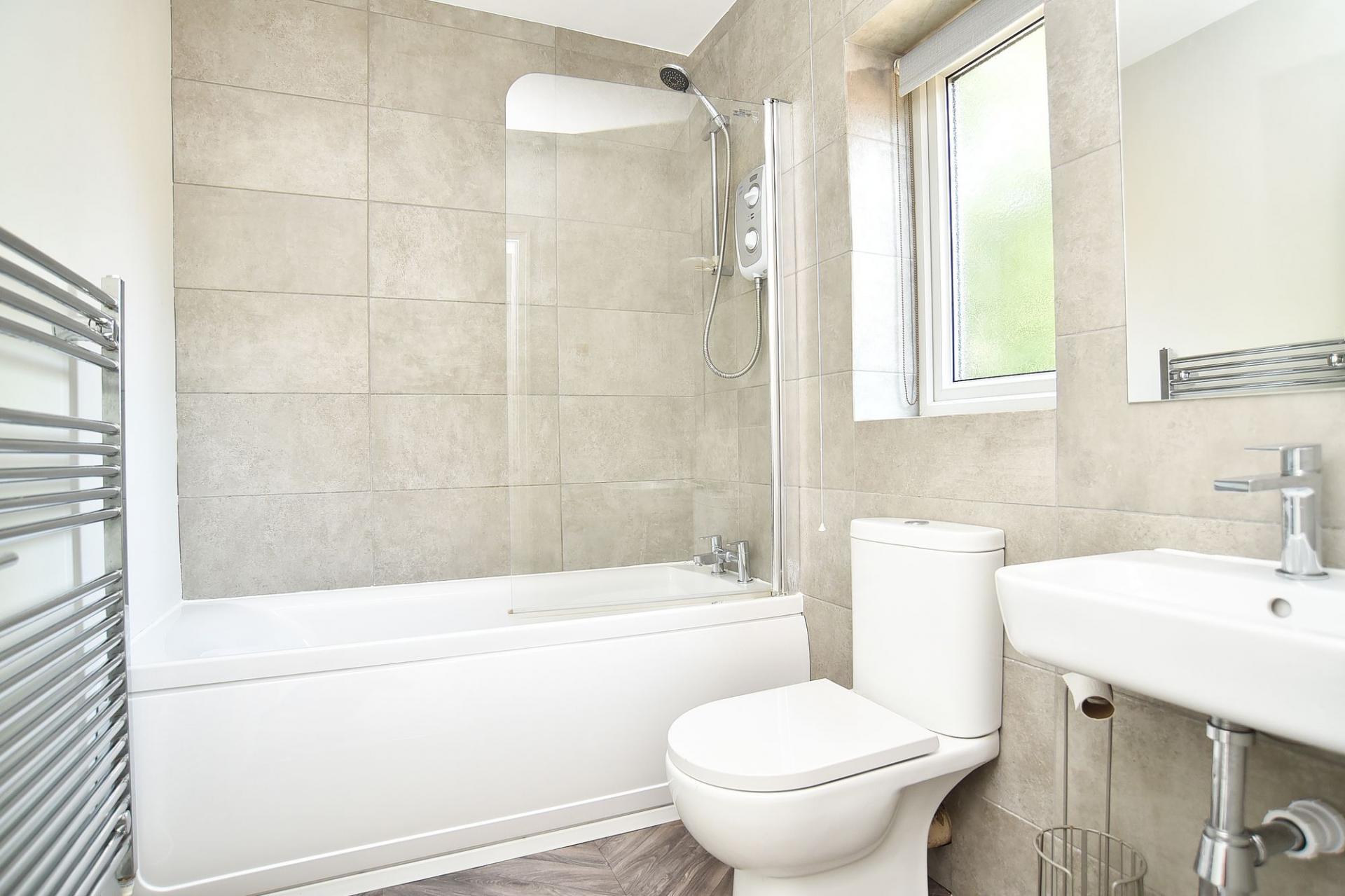 A white modern suite comprising WC, basin and bath with shower above. Heated towel rail.