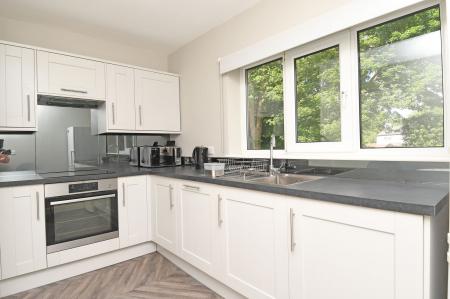 With space for dining area. The kitchen comprises a range of modern fitted units with electric hob, integrated oven, dishwasher, and washing machine.