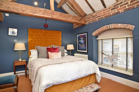The second floor provides an outstanding self-contained suite, ideal for guests or independent living. This versatile floor includes a living room/library centred around a solid-fuel burning stove, separate bedroom and a bathroom. Vaulted ceilings, exposed beams, brickwork, arched windows, and a bespoke glass room divider create a striking sense of space and character. The en-suite bathroom features a freestanding claw-foot bath with shower over and stripped wooden floors.
