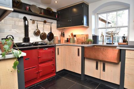An inner hall leads to a guest WC and the impressive contemporary breakfast kitchen, hand-built by The Main Company, with integrated appliances, Silestone work surfaces, Aga range, copper sink, glass display cabinetry and a dedicated barista bar. Dark slate tiled floors and exposed ceiling beams, and a further door out to the gardens complete the space.