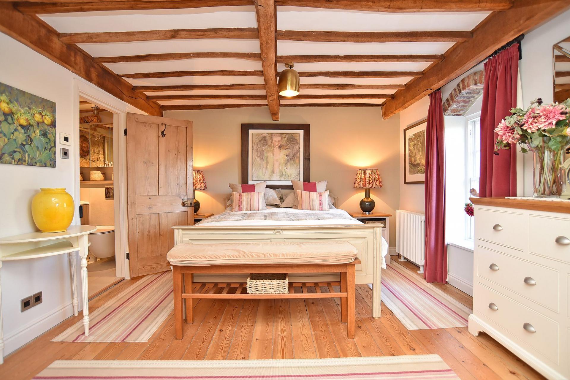 The ground floor is further enhanced by a formal dining room with exposed stone and wood-panelled walls, a corner stone feature fireplace and bespoke fitted dresser, and an adjacent sitting room with rustic brick walls, exposed beams, stripped wooden floors and custom shelving and display units.