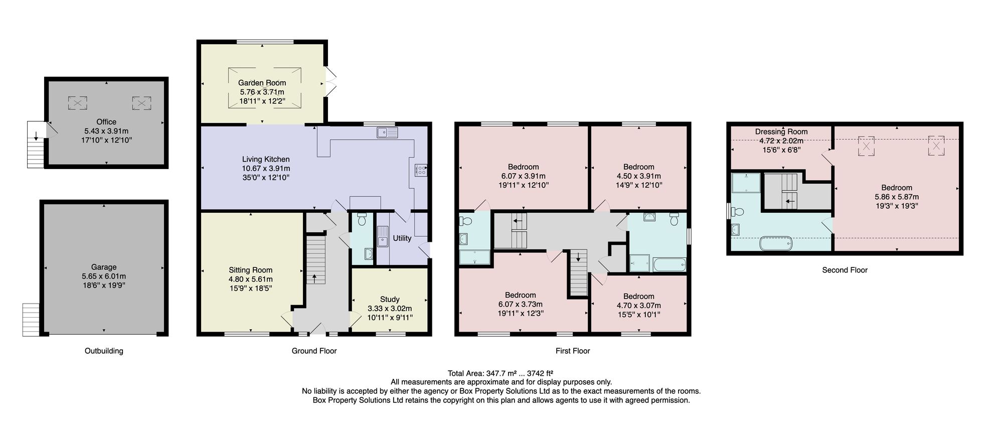 On the first floor, a central landing with storage leads to four double bedrooms, one with sleek modern en-suite shower room, together with a stylish family bathroom with bath and separate shower. The entire second floor is dedicated to a stunning vaulted principal suite, featuring a spacious bedroom, dressing room, and luxurious en-suite with freestanding bath and separate shower enclosure, enhanced by skylights and far-reaching views.