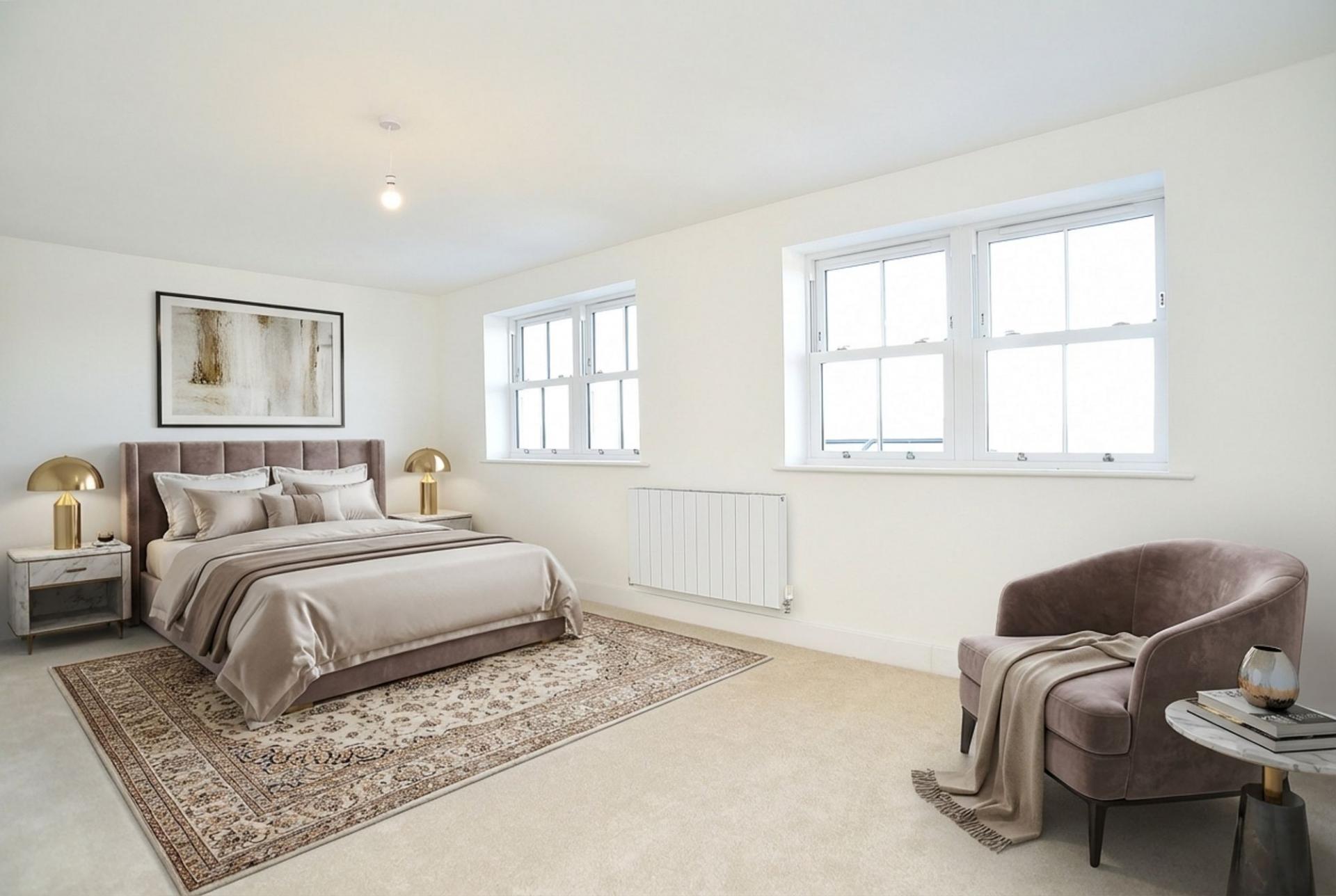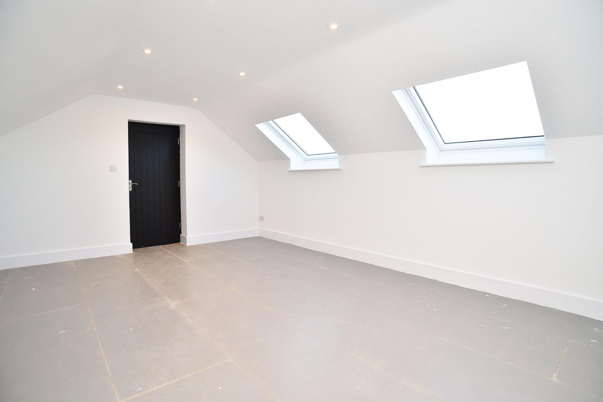 A superb vaulted double bedroom with skylights and windows.