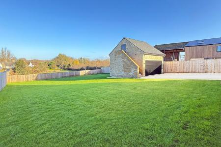 The property occupies an impressive elevated plot with superb outlook over the village and countryside beyond. A gravelled side driveway provides ample parking and leads to the detached stone-built two-storey double garage, with electric doors, garden store beneath, and an outstanding vaulted first-floor room used as a home office but could also be used gym or studio.
