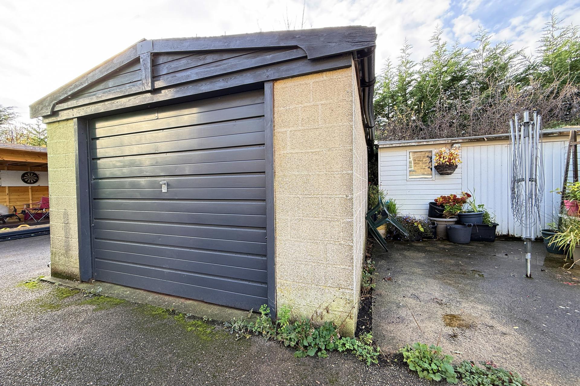 OUTSIDE Outside, the property enjoys a lawned terraced garden to the front and an enclosed gravelled courtyard to the rear with an access gate leading to an access road and a detached garage beyond.