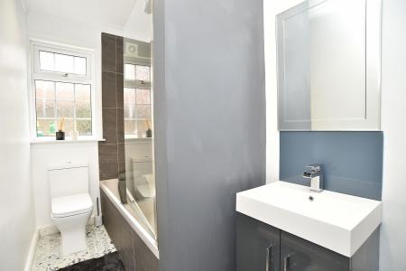 Modern suite comprising bath with shower over and screen, low-flush WC and vanity unit with inset washbasin. Window to rear elevation.