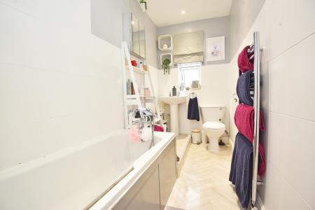 A white suite comprising WC, washbasin, and bath with shower above. Heated towel rail.