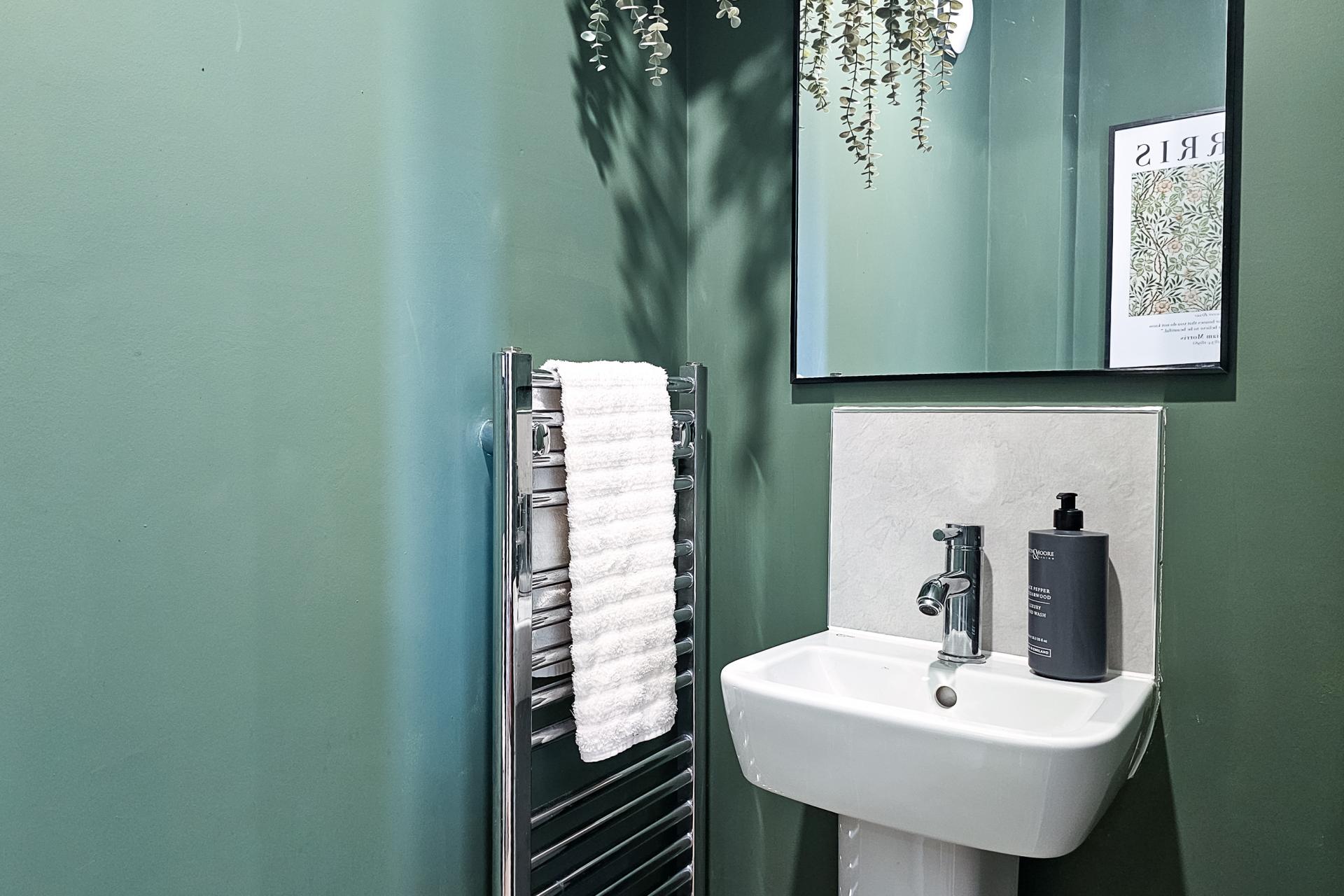 Love bathroom suite with panel bath having shower attachment And screen, Low flush WC And pedestal wash Basin. Heated chrome ladder towel rail.
