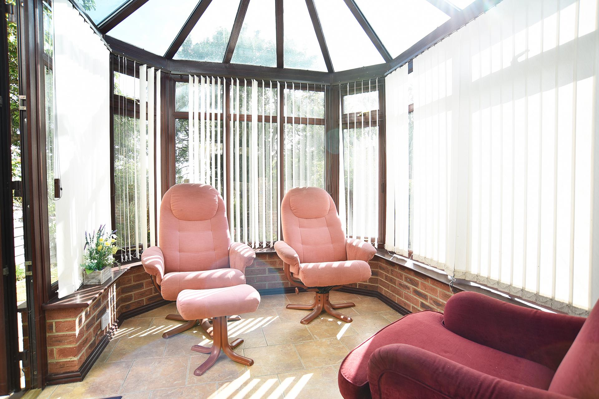 A bright and airy additional sitting area with windows and glazed doors overlooking the rear garden.