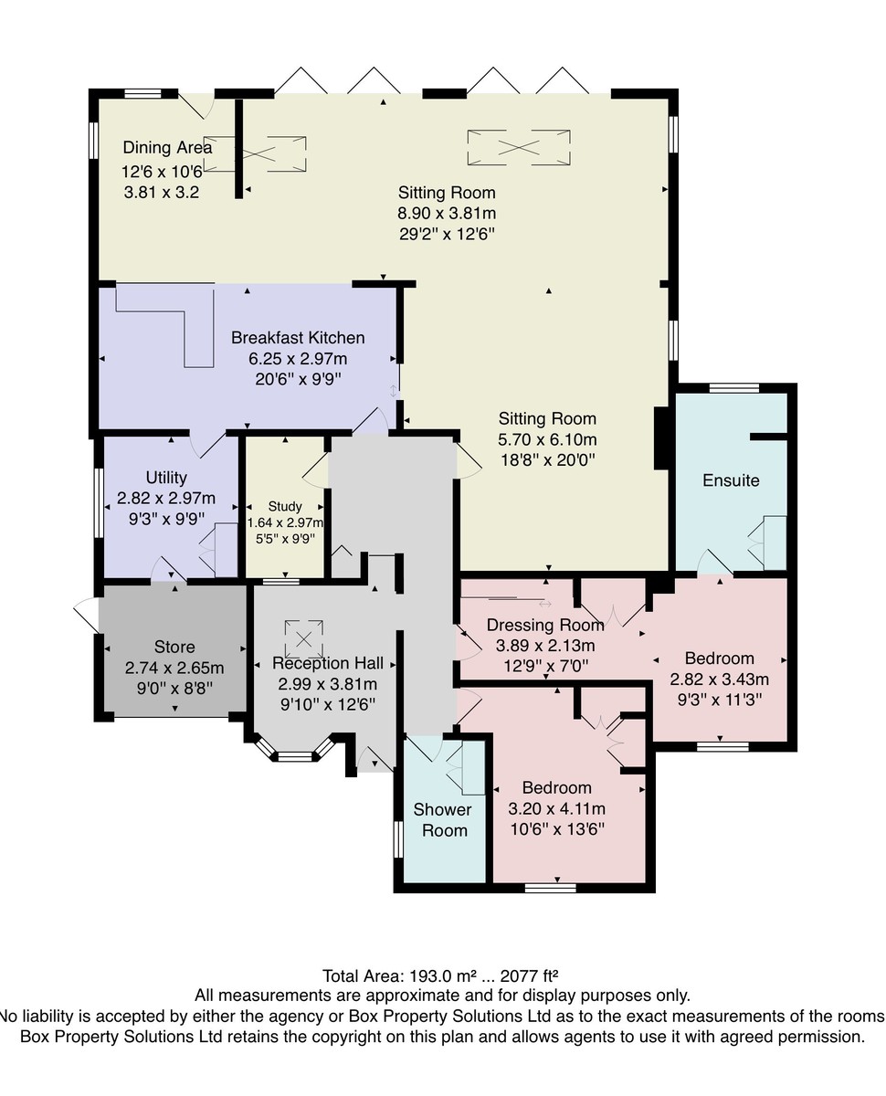 A utility room and integral store offer practical convenience. The principal bedroom suite enjoys a dressing area and spacious en-suite bathroom, while a second double bedroom includes fitted wardrobes. A stylish shower room and a dedicated study complete the accommodation.